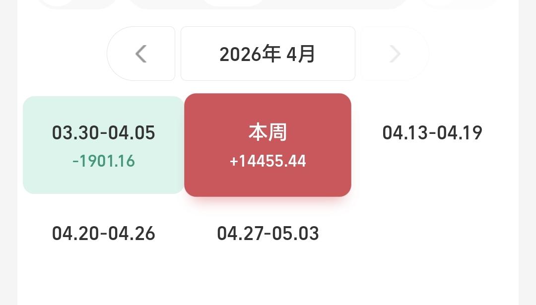 本周有了三个交易日,一亏两盈,一个交易日亏损,两个交易日盈利,周收益14455元。