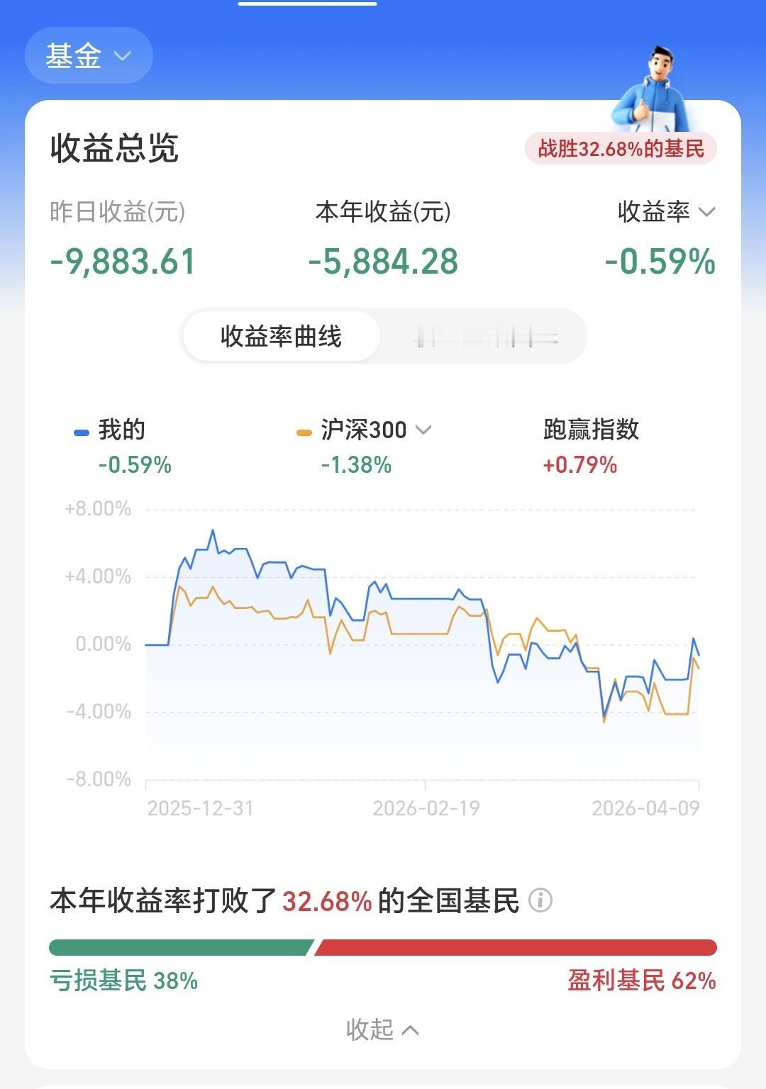 今年以来亏损5884元,亏损率0.59%,跑赢了全国32.68%的基民,也跑赢了沪深300指数1.38%的下跌幅度。