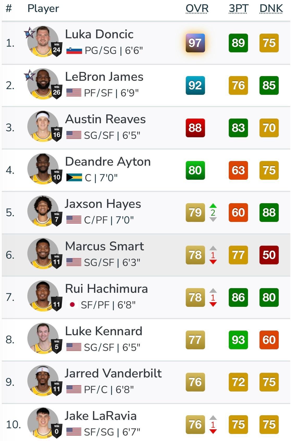 NBA2K能力值再次更新,湖人队:海斯+2,斯玛特-1,八村塁-1,拉拉维亚-1,布朗尼+1。