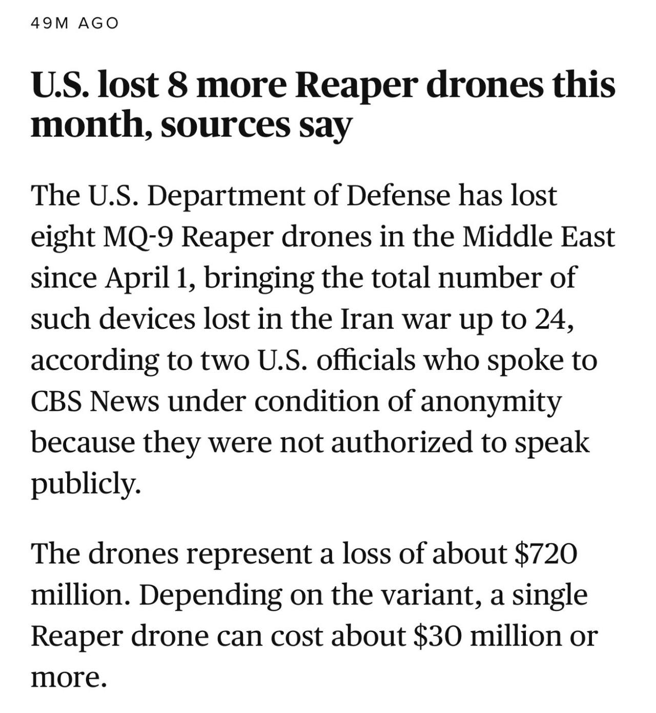 美军在整个爱泼斯坦军事行动期间共损失24架MQ-9“捕食者”无人攻击机,其中3月