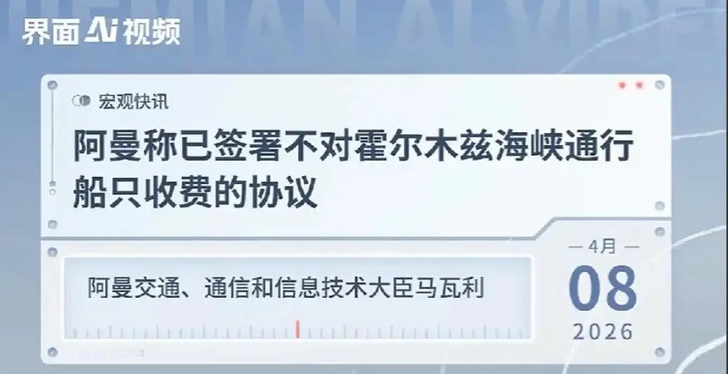 ​​当地时间8日,阿曼交通、通信和信息技术大臣马瓦利在协商会议上表示,阿曼已签署不对霍尔木兹海峡通行船只收费的协议。阿曼交通、通信和信息技术大臣马瓦利表示,阿曼已签署与国际海运相关的协议,根据协议规定,霍尔木兹海峡为天然通道,不能对通行船只征收费用。
