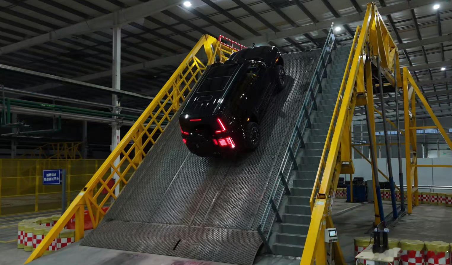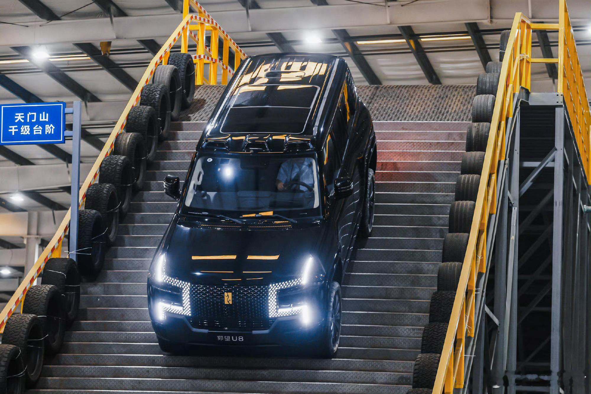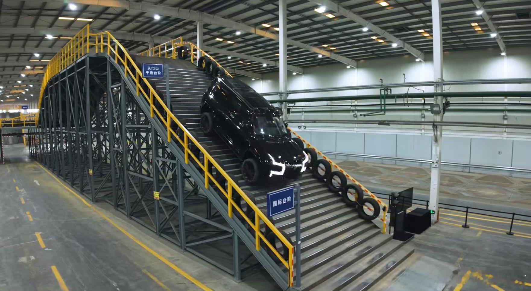 45度超滑陡坡,人站上去都站不稳,仰望U8正爬、倒爬、半坡悬停起步,稳得一批,一点不打滑。还有一比一钢制复刻的天门山天梯,台阶又窄又滑,难度比真山路还狠,它倒着爬居然比正着爬更丝滑……