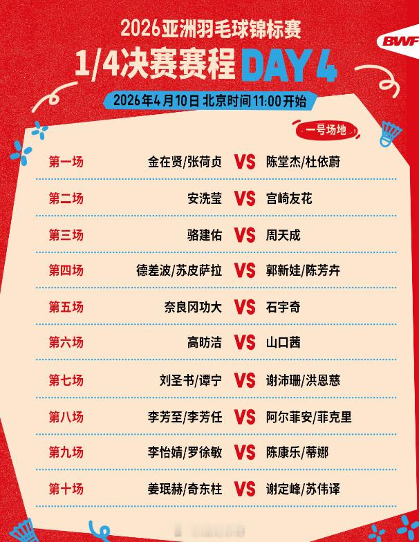 2026年亚洲羽毛球锦标赛今天(10日)迎来1/4决赛,将于北京时间11时开赛。