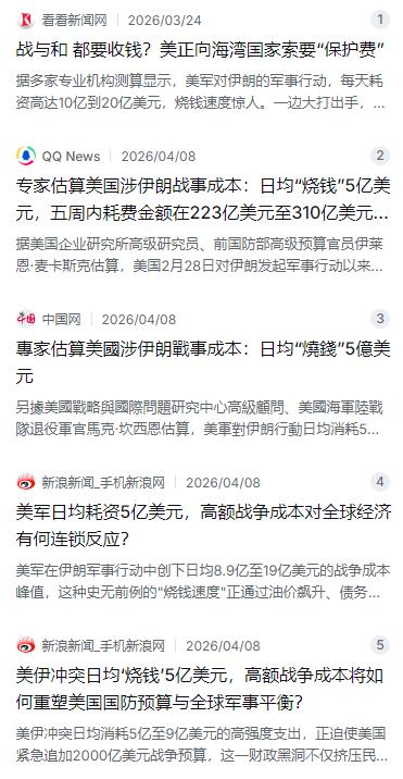 先说说中东那边的情况。从2月28日开始,美国联合以色列对伊朗发起了大规模军事行动,这一打就是几十天没消停。美国企业研究所的高级研究员、前国防部预算官员伊莱恩·麦卡斯克经过测算发现,这场仗打下来,每天烧掉的军费高达5亿美元,五周时间累计消耗在223亿到310亿美元之间。更夸张的是,有军事专家评估认为,最高峰时期每天的花费甚至可能冲到8.9亿到19亿美元这个水平。