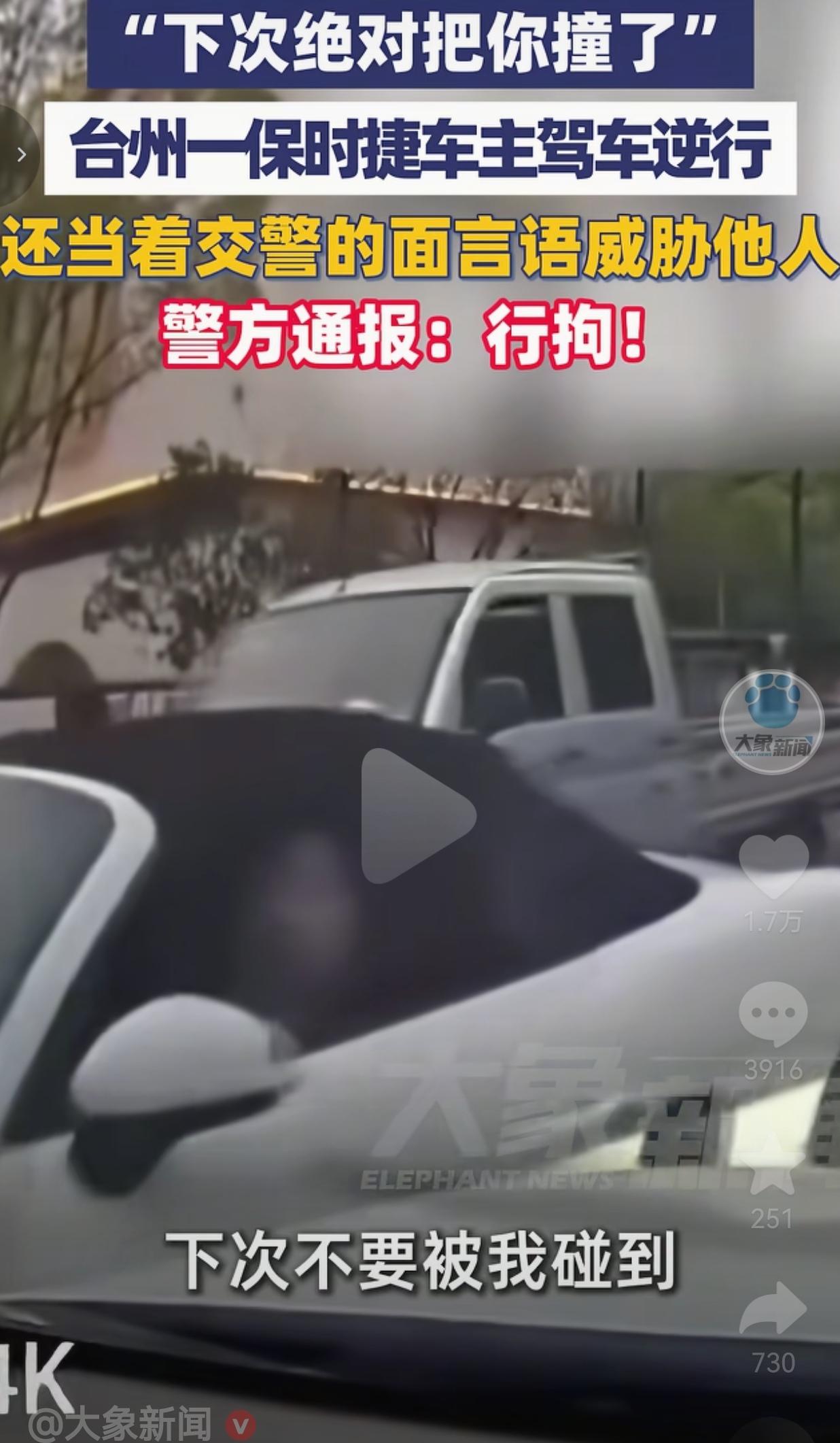 4月10日,台州公安局椒江分局作出警方通报:逆行:罚款200元、记3分,威胁人身安全:依法行政拘留 ,一纸处罚,可谓大快人心!
