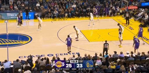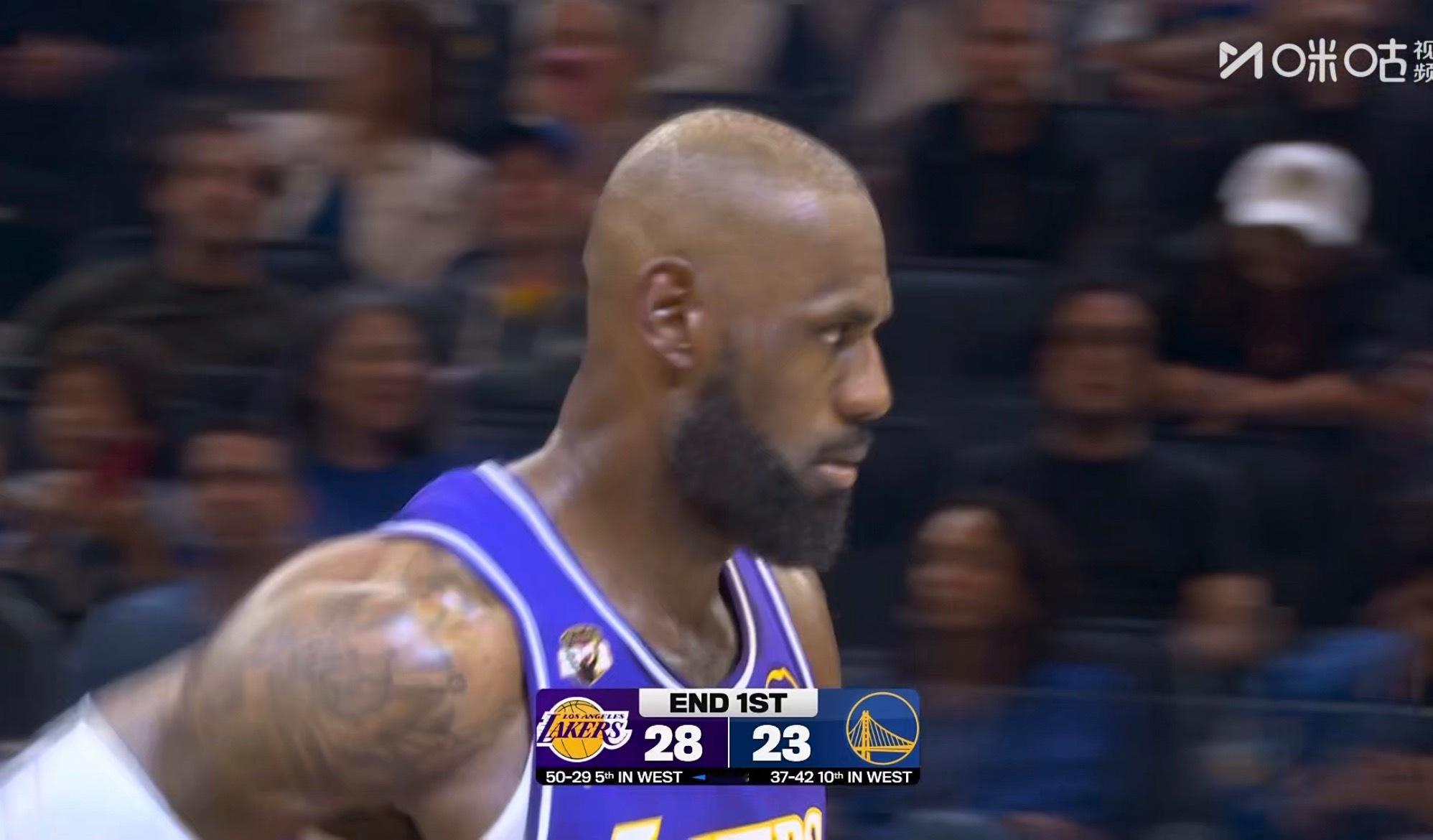 老詹第一节拿到12分! 父子连线暴扣,顶投三分。湖人vs勇士