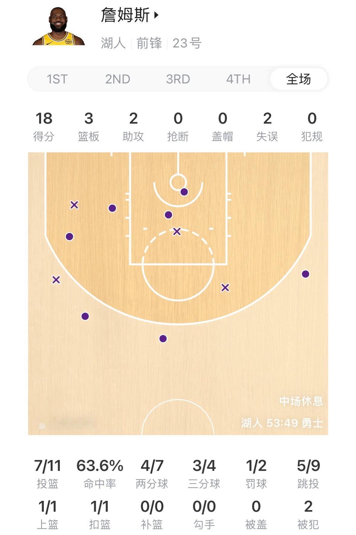 詹姆斯单核,半场18分3板2助攻,投篮11中7,三分4中3,罚球2中1,正负值+3。湖人vs勇士