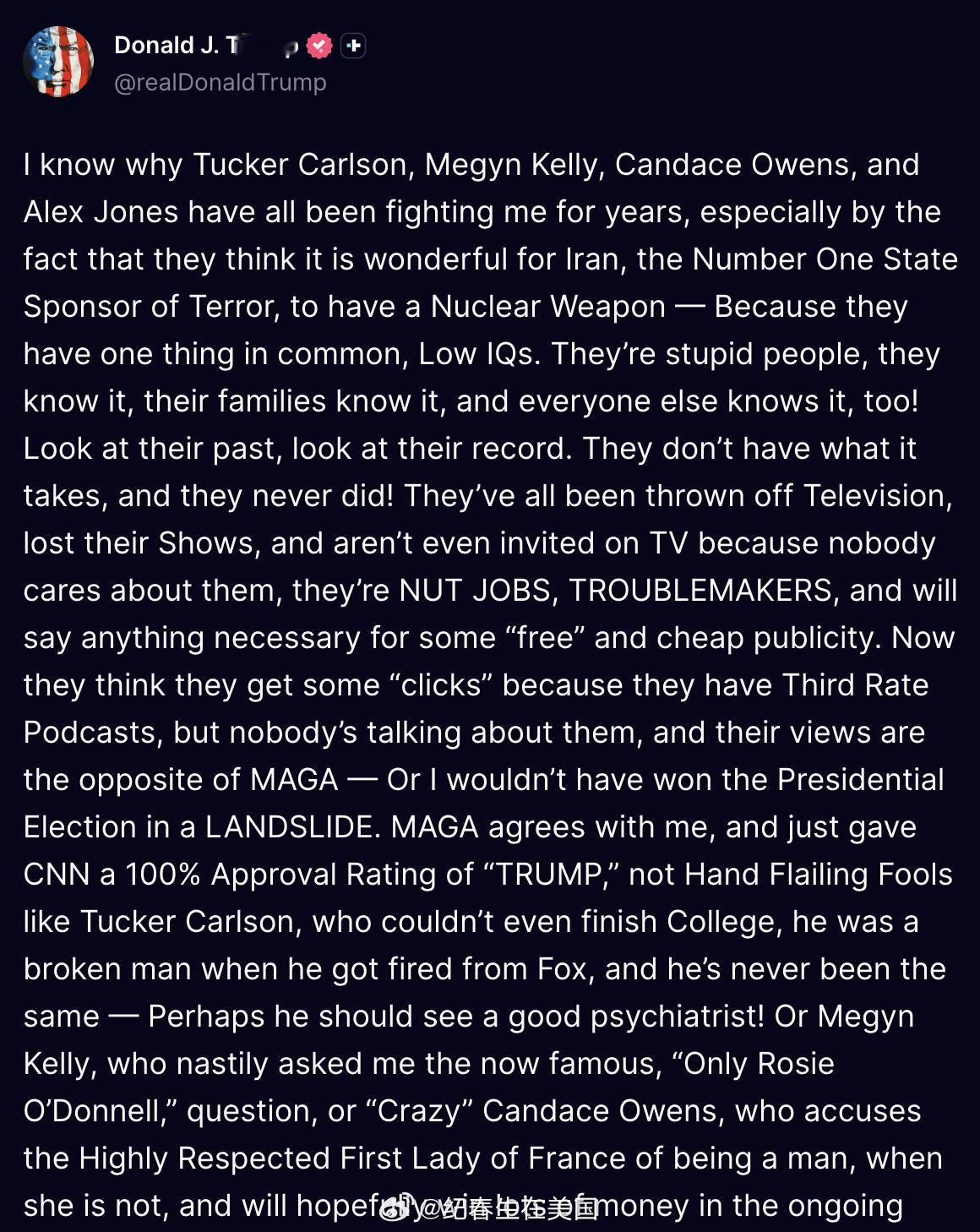 “我知道为什么Tucker Carlson、Megyn Kelly、Candace Owens和Alex Jones这些年来一直跟我作对,尤其是他们居然觉得让伊朗,这个全球头号支持恐怖主义的国家拥有核武器是一件很美妙的事。原因只有一个:他们有个共同点,智商低。