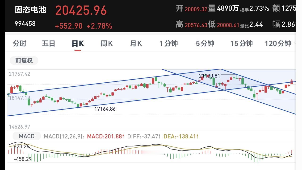 固态电池板块前几天上涨突破了日线级别下跌通透的上轨线,今天又上涨回到了原来的上涨通道内,日线级别重新变成了上涨趋势,短线的人可以要不要考虑进场。