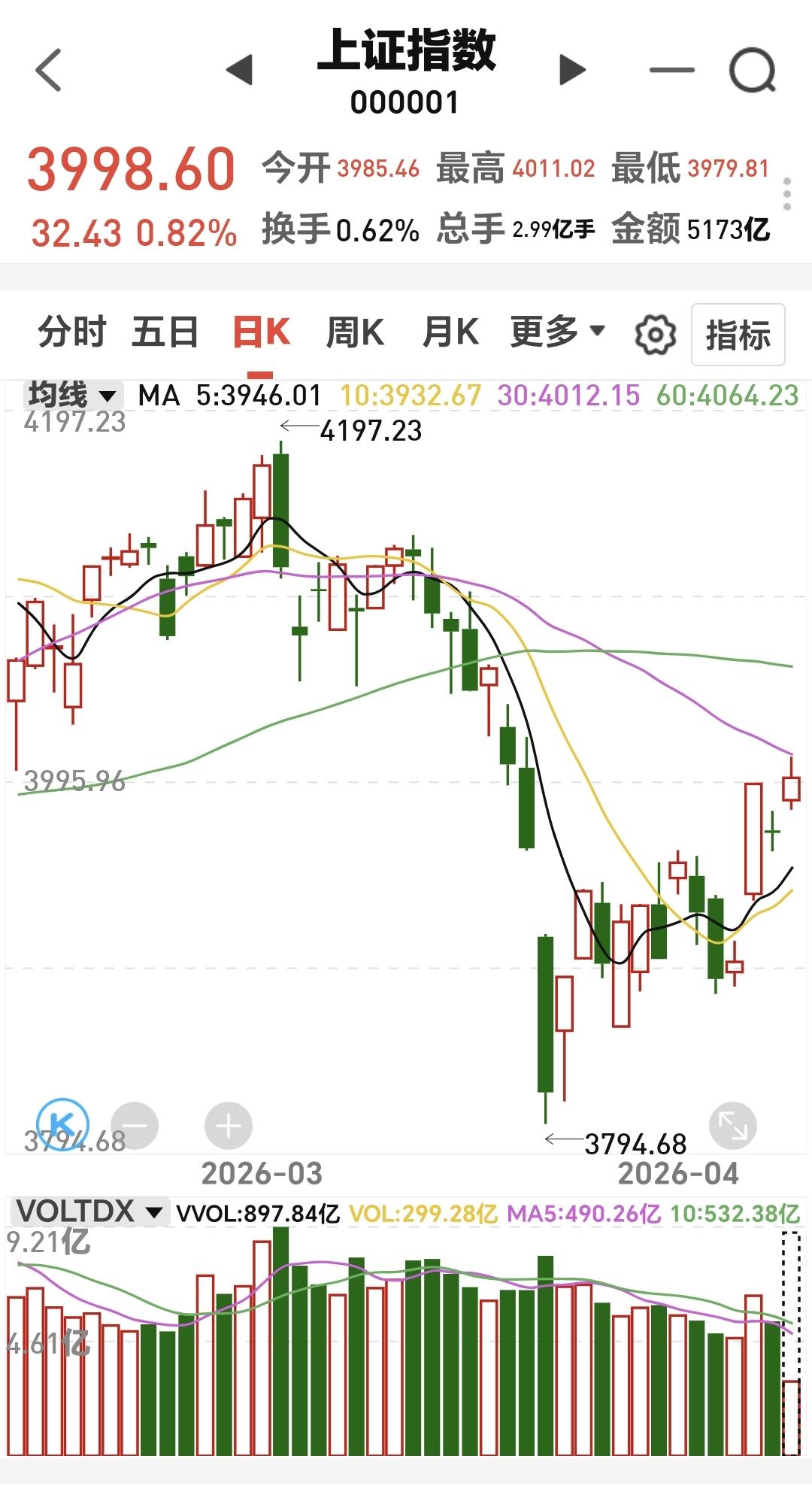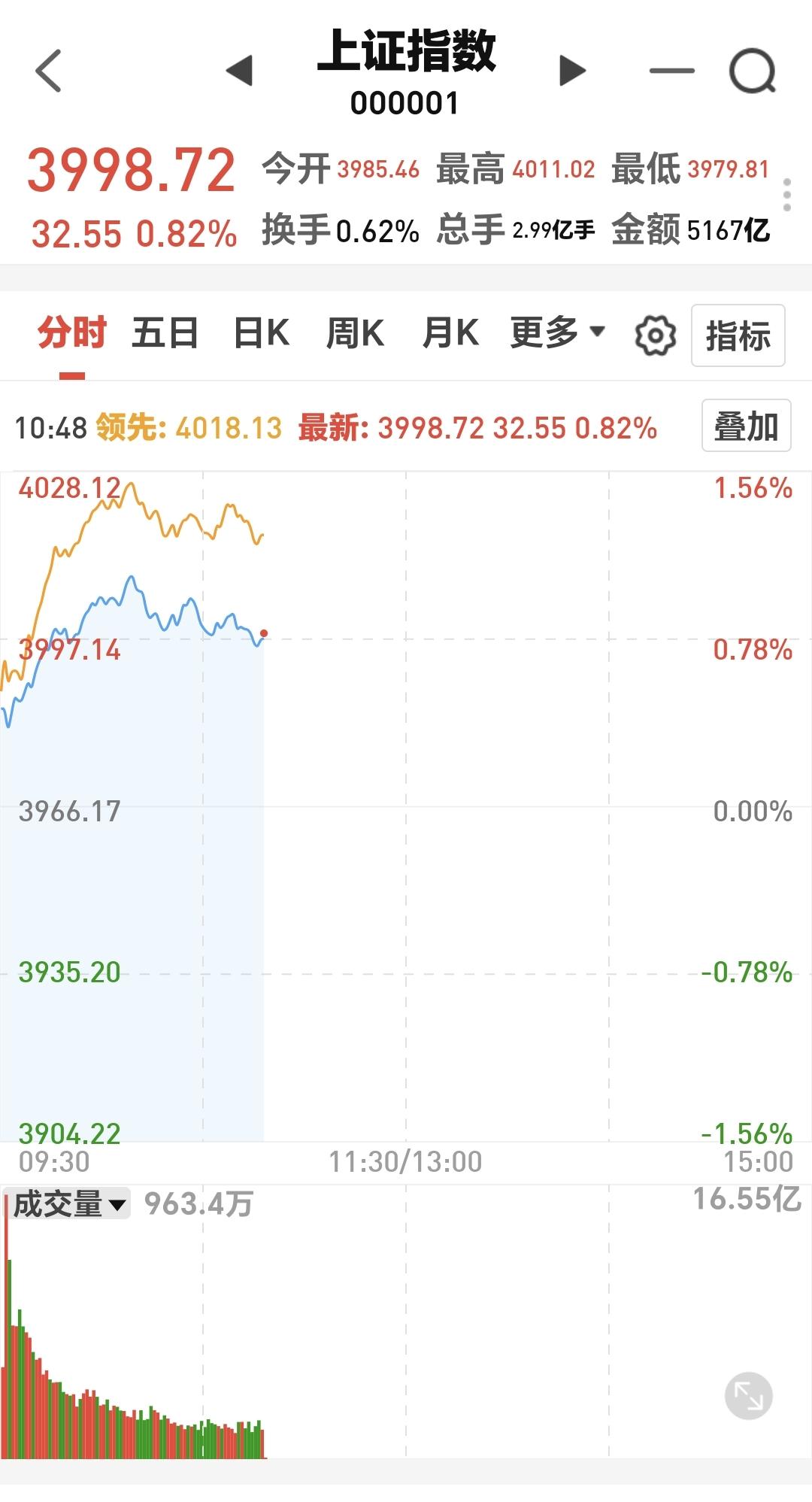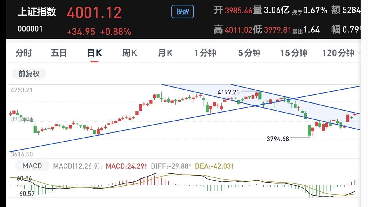 上证指数盘中最高4011点,距离我早上讲的4015点的压力位置只相差了4个点,下午还是要观察这个4015点,如果突破4015点,就有很大的概率已经反转。