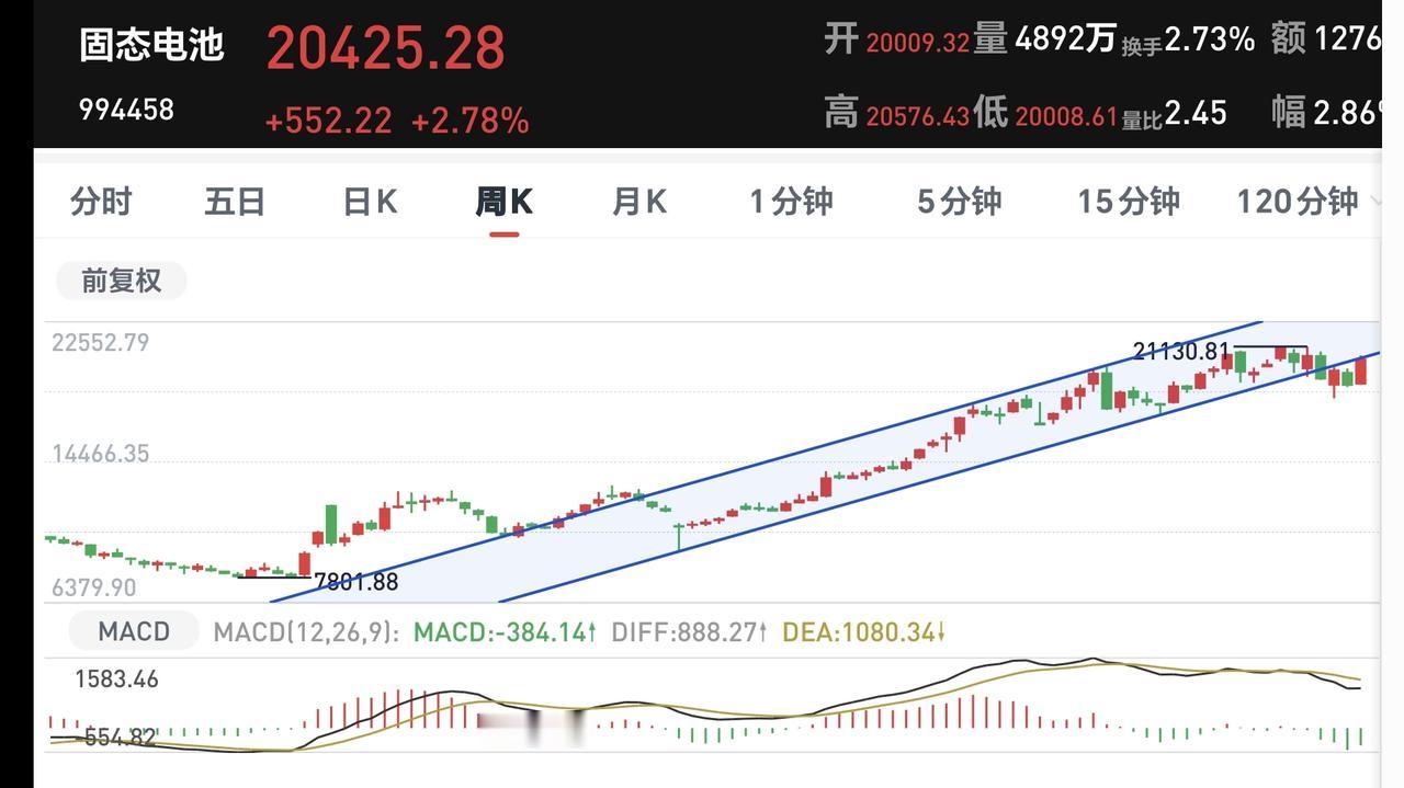 固态电池板块几周之前跌破了周线级别上涨通道的下轨线,今天的上涨来到了这个上涨通道的下轨线上,但还没有确定是能够回到原来的上涨通道内,如果今天收盘之前能够重新回到原来的上涨通道内,长线的人可以继续持有,想进场的人也可以考虑要不要进场。