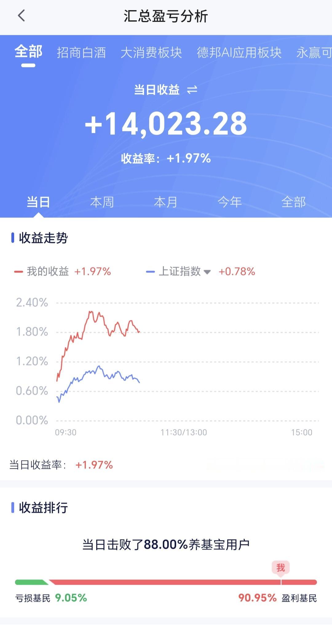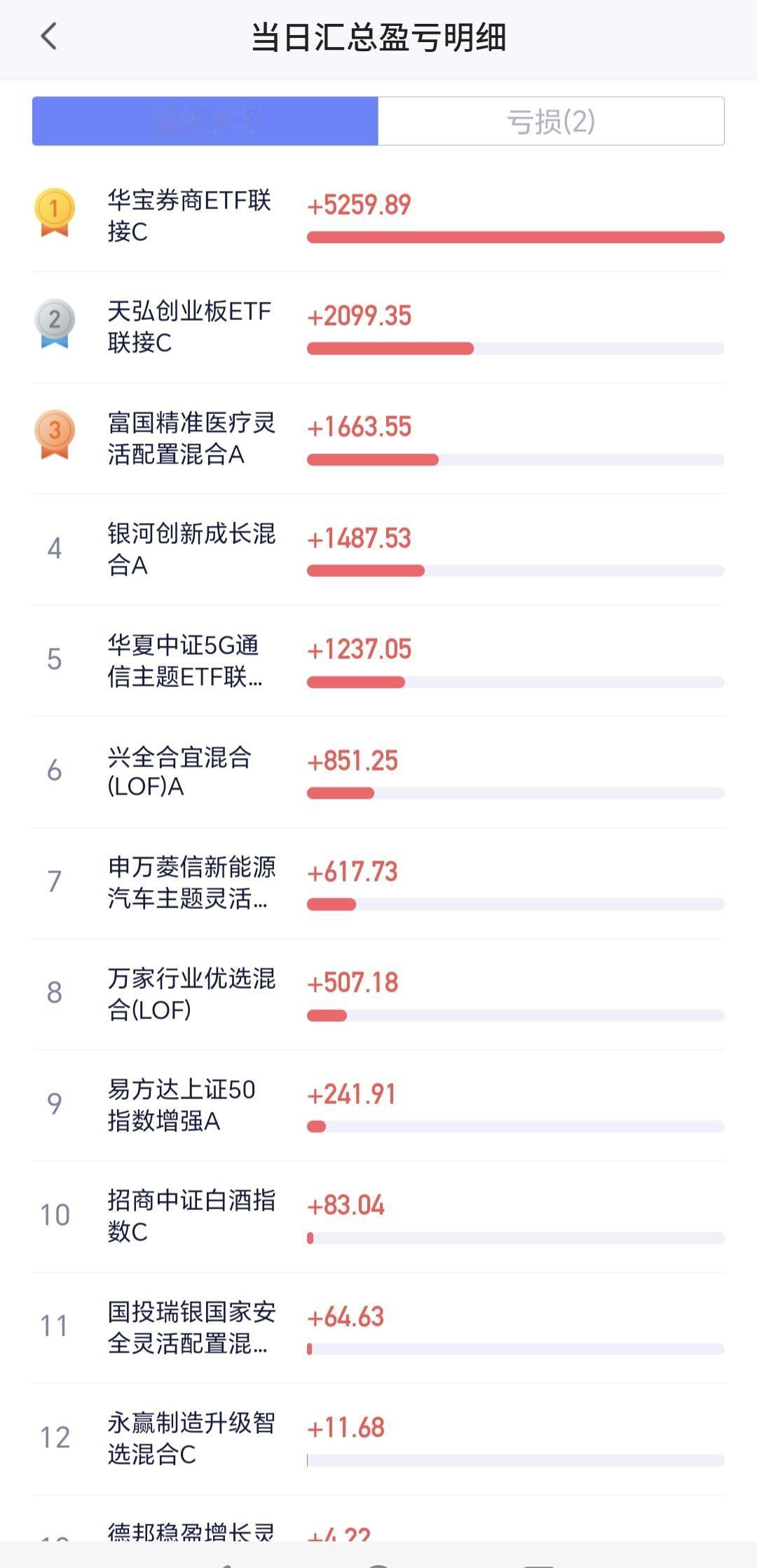 持有基金现在盘中估值上涨了14023元,盈利金额最大的三个板块是:证券板块,创业板指,创新药板块,亏损的只有大消费板块。