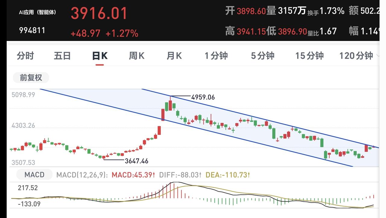 AI应用板块日线级别处于下跌通道中,今天的上涨又来到了这个下跌通道上轨线附近,近期观察能不能上涨突破这条上轨线,如果有效突破这条上轨线,短线的人就可以考虑要不要进场。