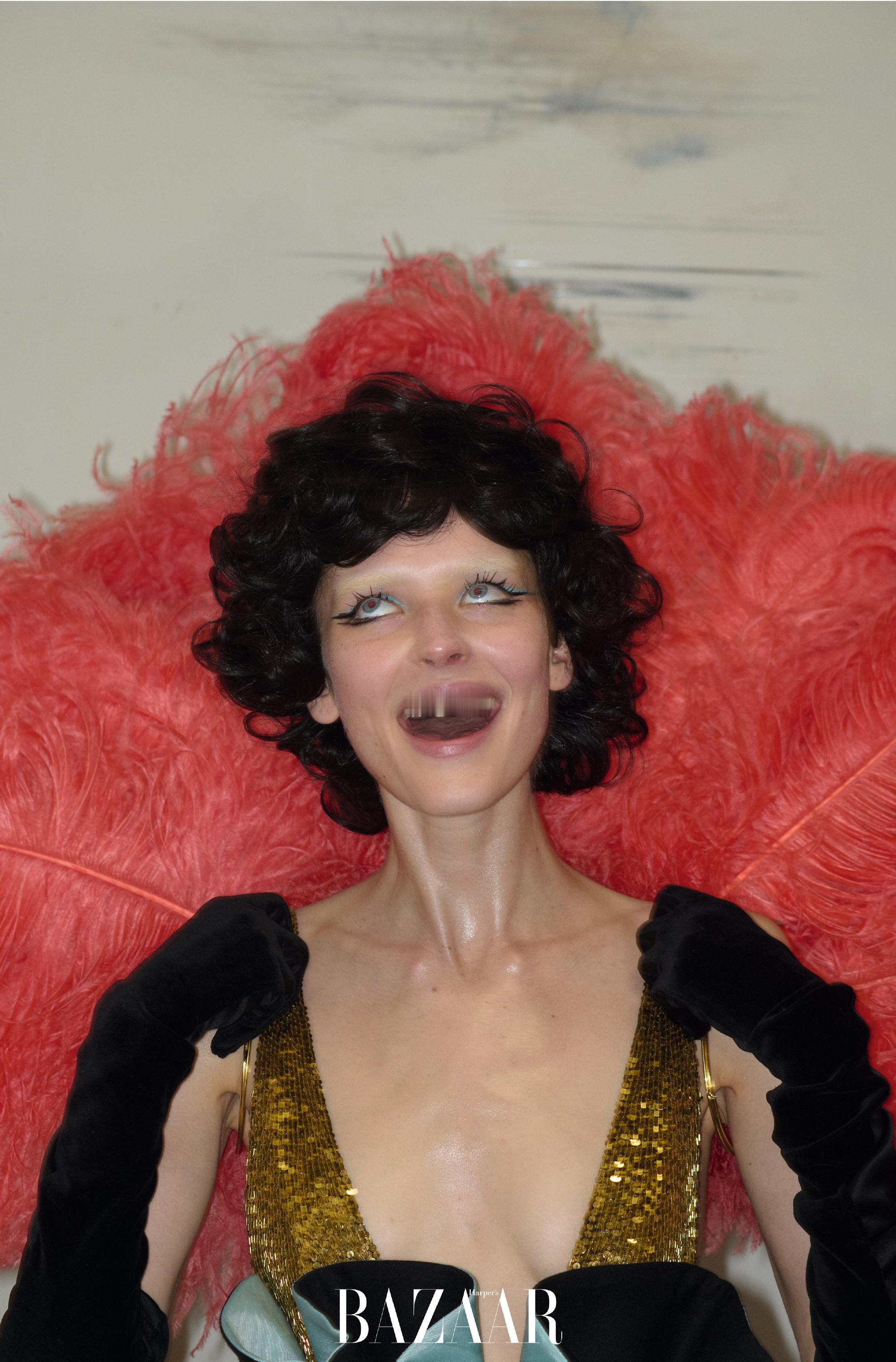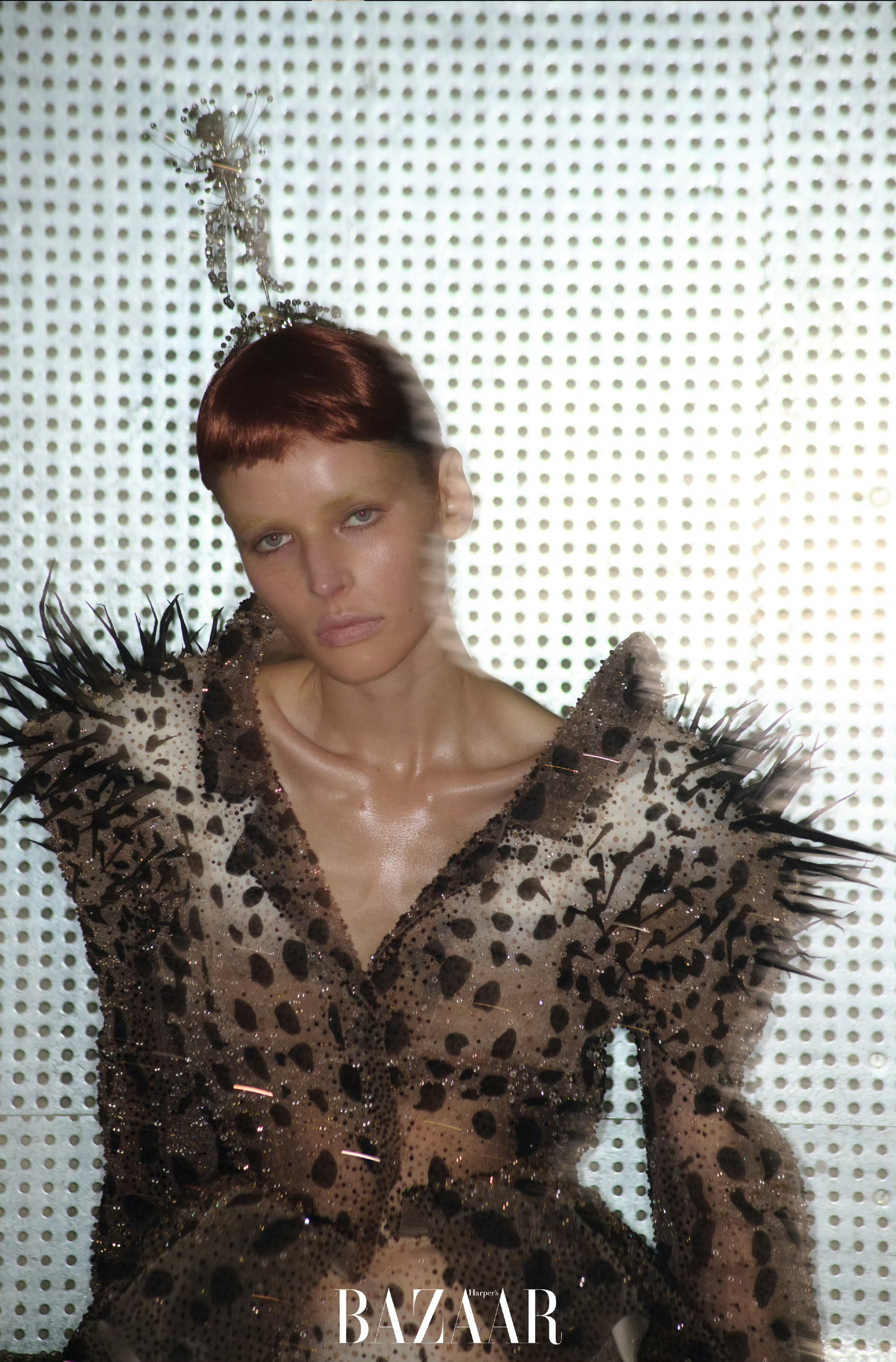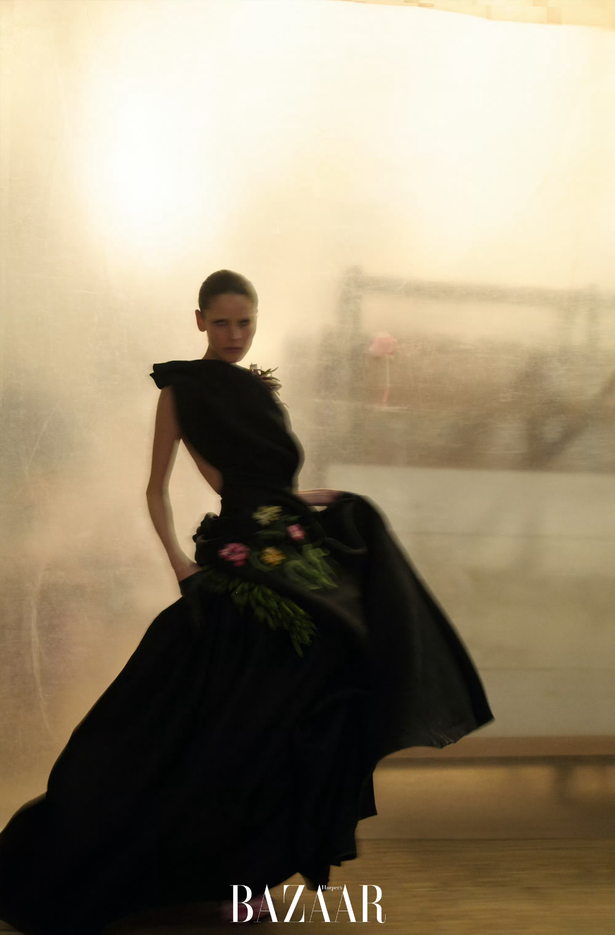 时尚芭莎四月刊独角戏,舞台只有她一人。那袭华服穿在身上,狂欢在远处亮着,金箔般耀眼。