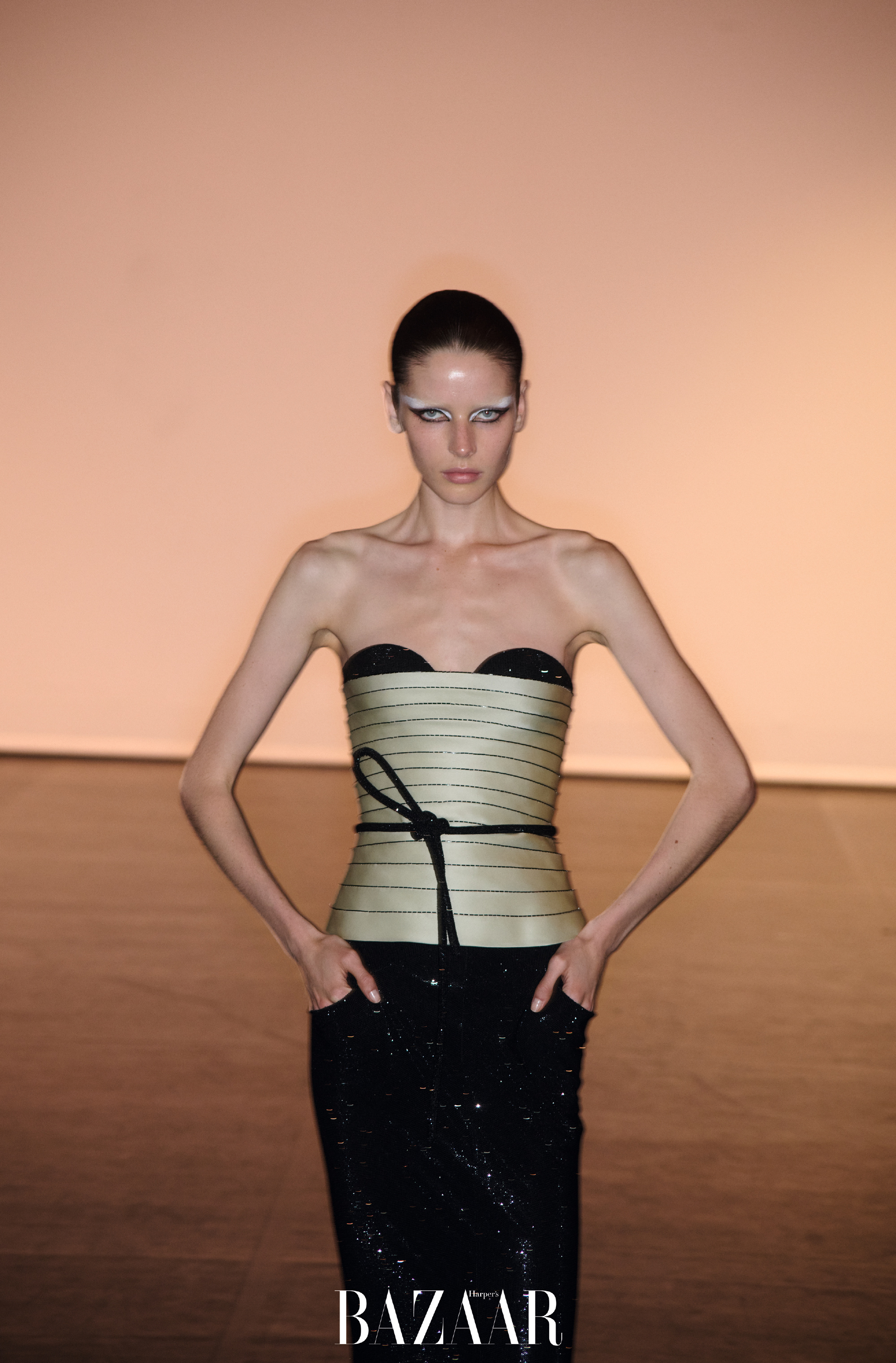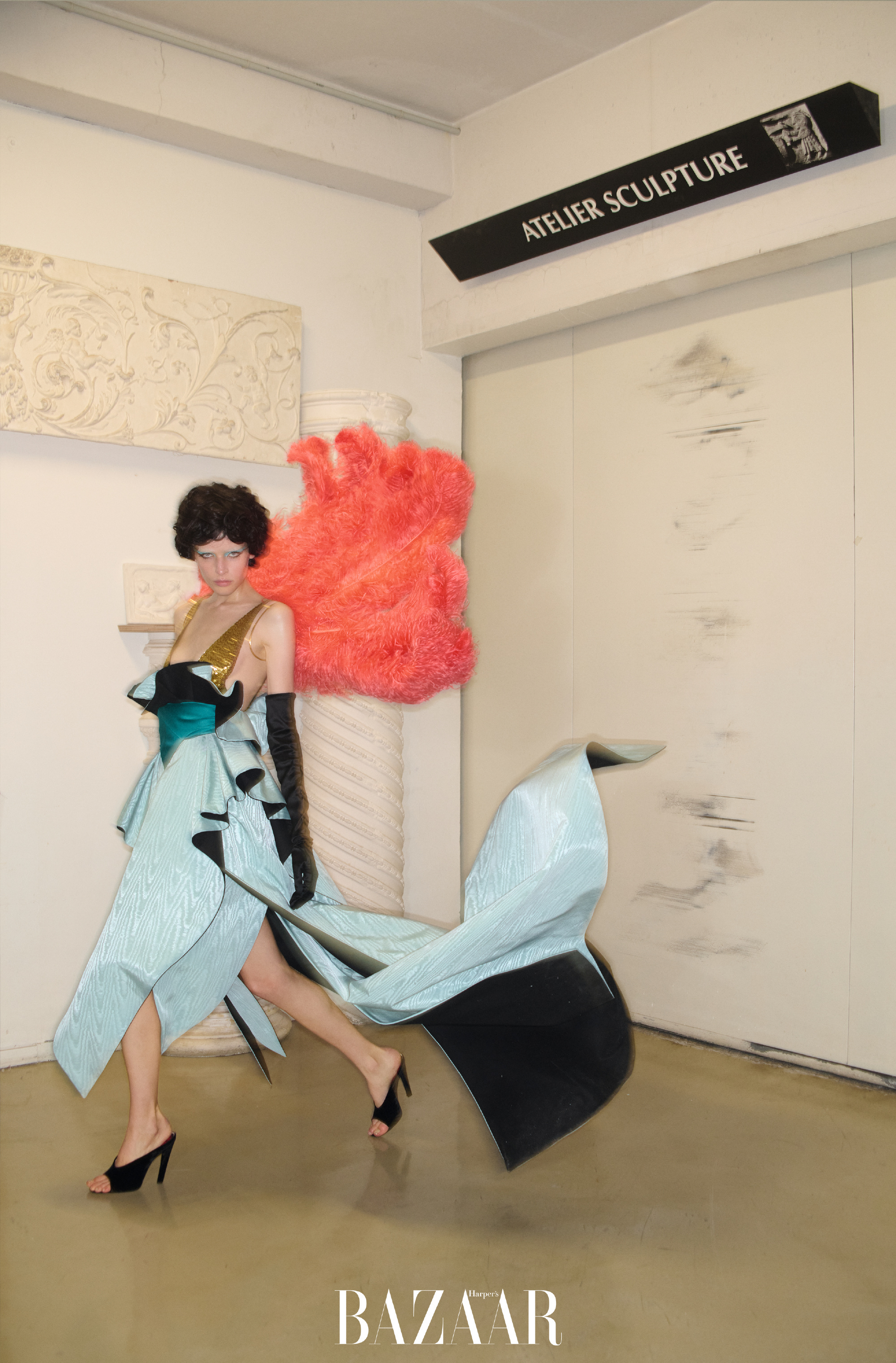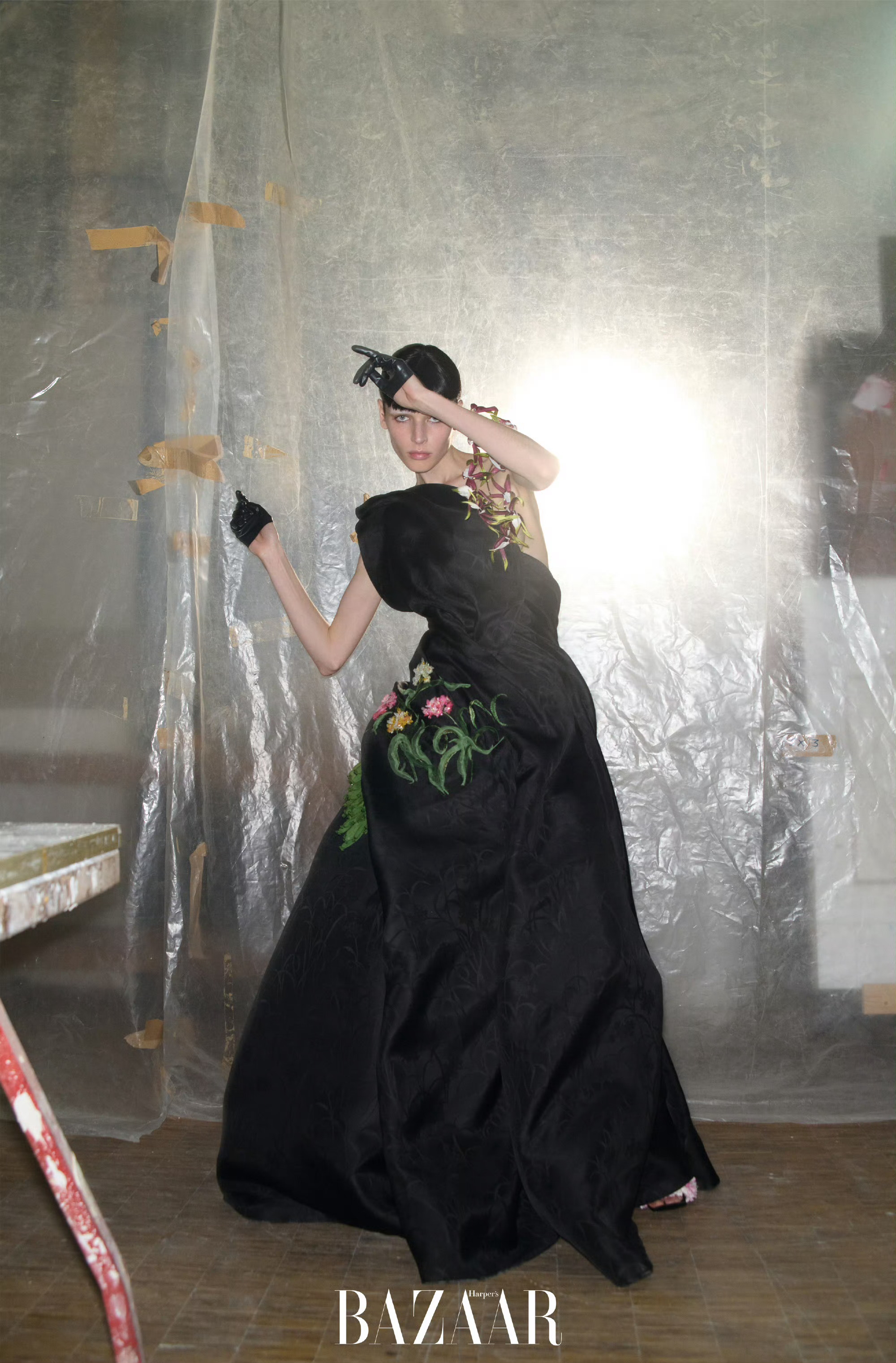 时尚芭莎四月刊独角戏,舞台只有她一人。那袭华服穿在身上,狂欢在远处亮着,金箔般耀眼。