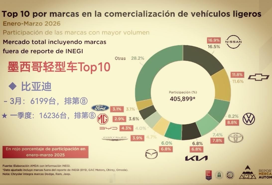 比亚迪墨西哥(不包括腾势),3月销量6199台(年内新高),排第八;1-3月,累销16236台,排第⑧!