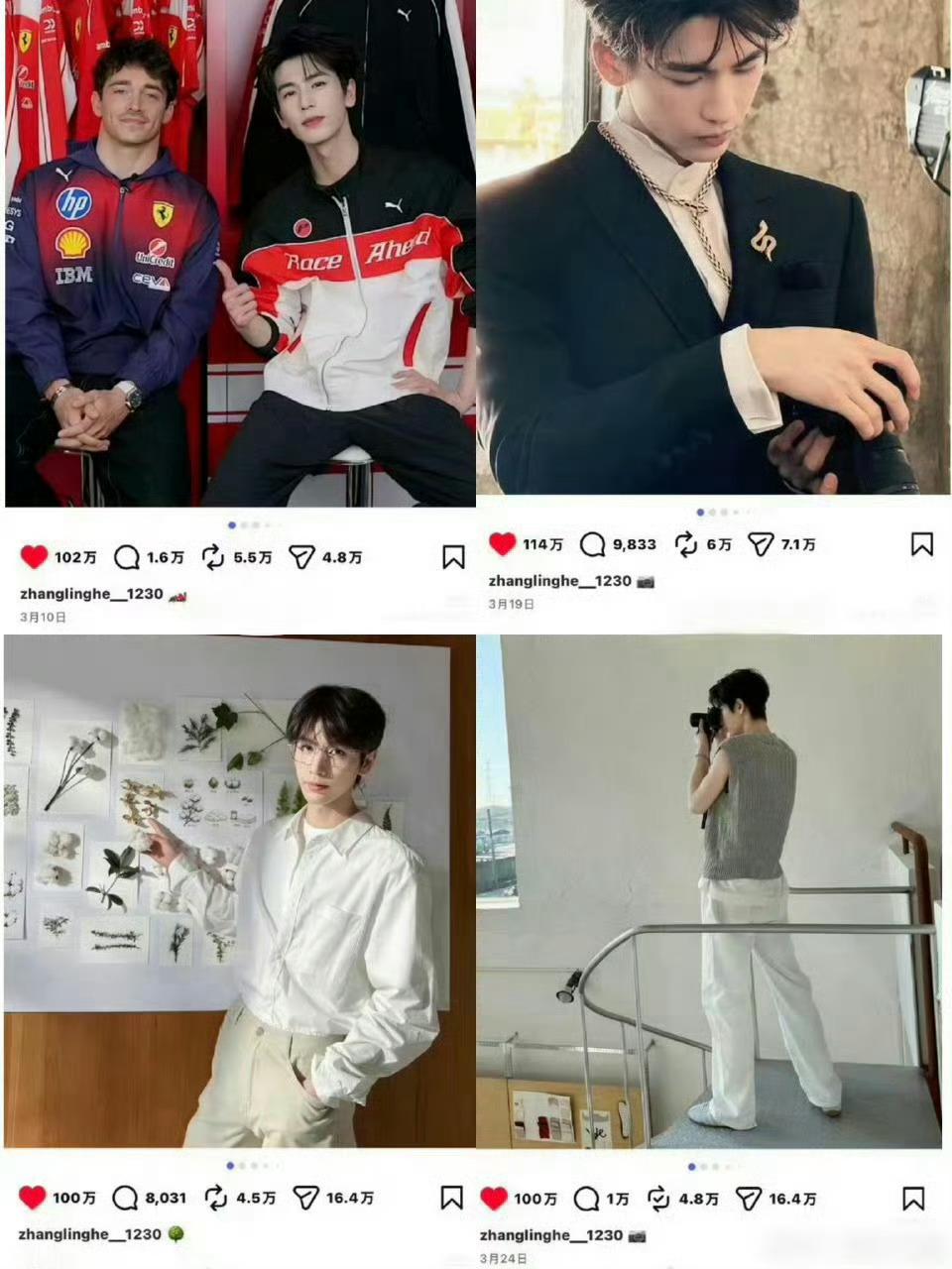 张凌赫最新一条ins20小时点赞破百万已经有5条点赞破百万!张凌赫海外是真的火!