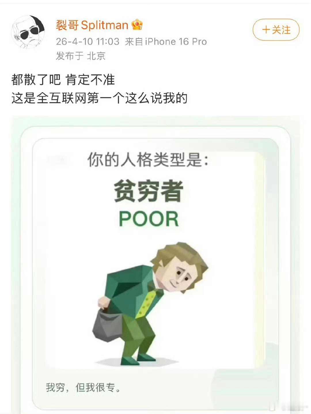 苏醒王铮亮POOR和ATMER苏醒王铮亮贫穷者和送钱者苏醒和王铮亮都觉得SBTI不准,可一个贫穷者一个送钱者,这巧合也太好笑了。苏醒说SBTI测试不准