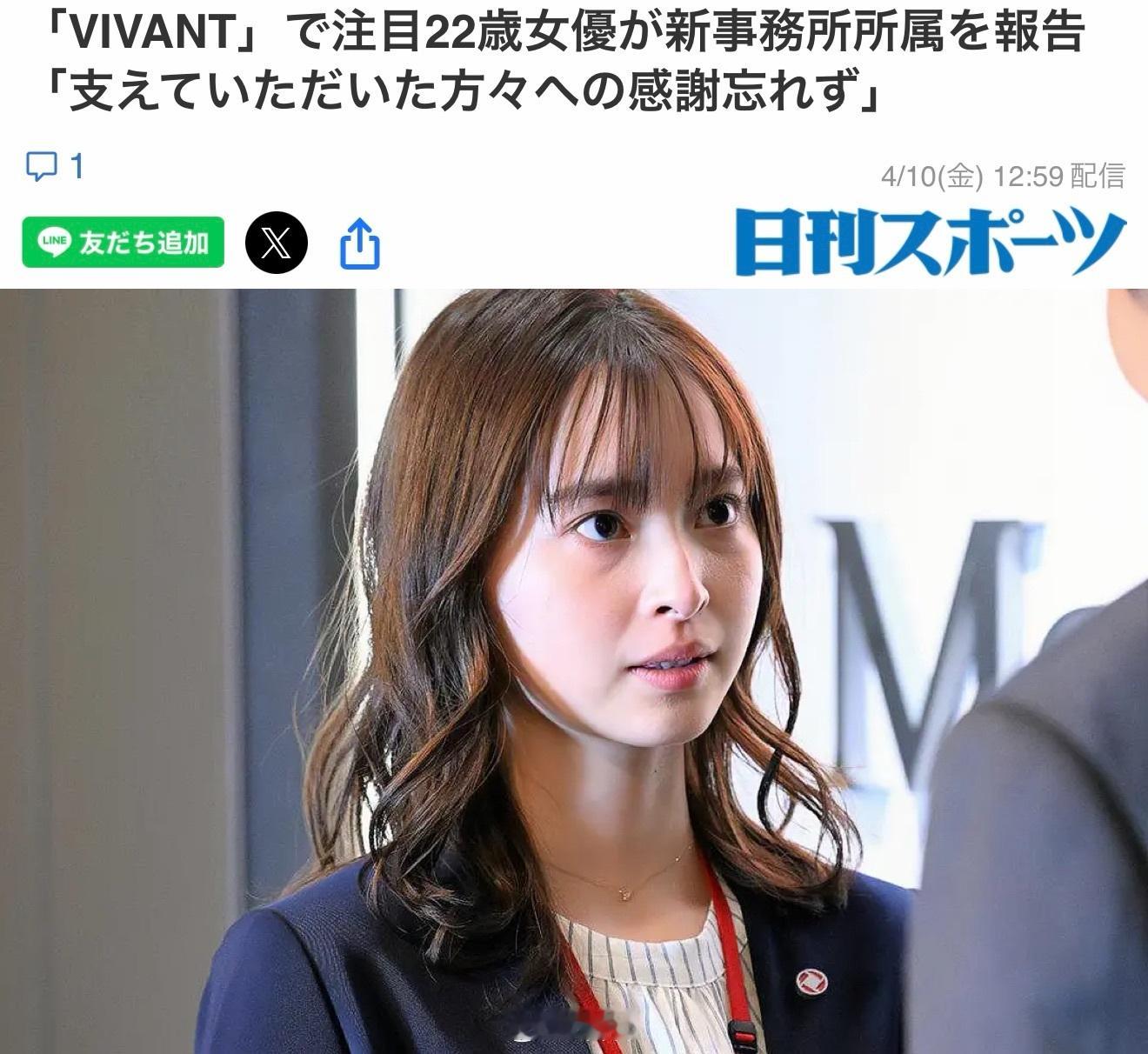因出演TBS连续剧『VIVANT』(别班)而备受关注的女演员饭沼爱(22岁),于10日更新INS宣布加入新事务所TSUKIMI。