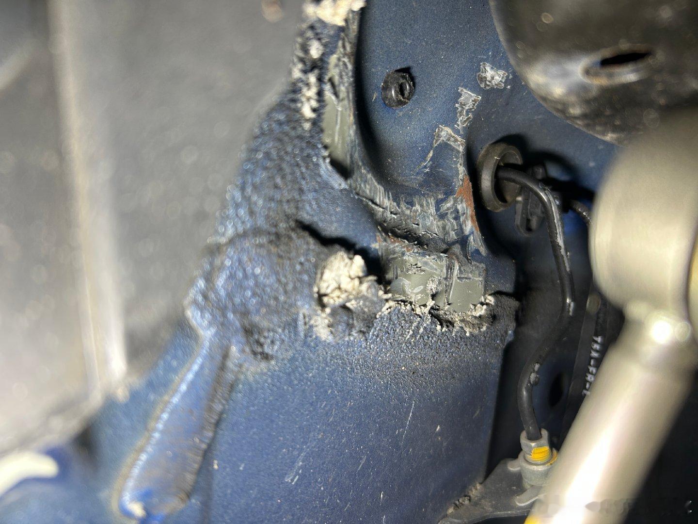 从机舱方向看下去,前纵梁是没有问题的;但从轮拱内部看过去,当时的冲击应该是很大的,已经波及到了纵梁,并且修的非常对付,仅仅是用角磨机打磨掉了撞击之后凸起来的对悬挂运动有影响的部分,没有做任何其他修复。