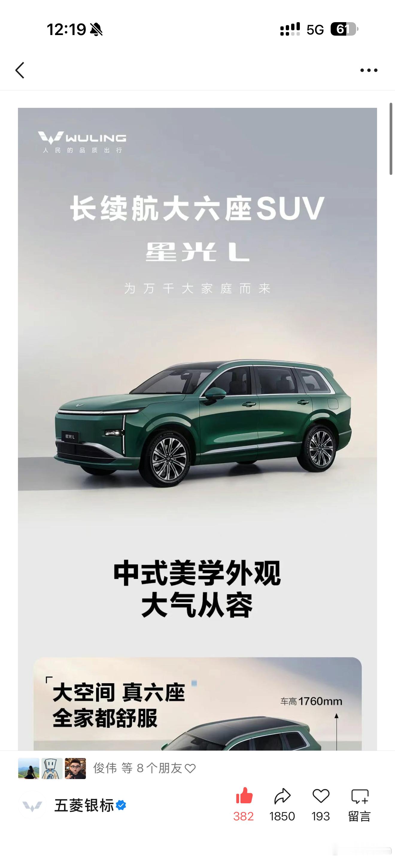 五菱又一款六座SUV星光L亮相4980的车长,2950的轴距做成了六座可见空间利用率之高星光家族主打年轻化和产品力估计有惊喜