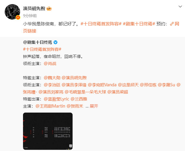 胡先煦小爷我是陈俊南胡先煦官宣十日终焉 胡先煦官宣十日终焉,胡先煦小爷我是陈俊南,期待住小胡新角色的见面,恭喜官宣~ 十日终焉开机