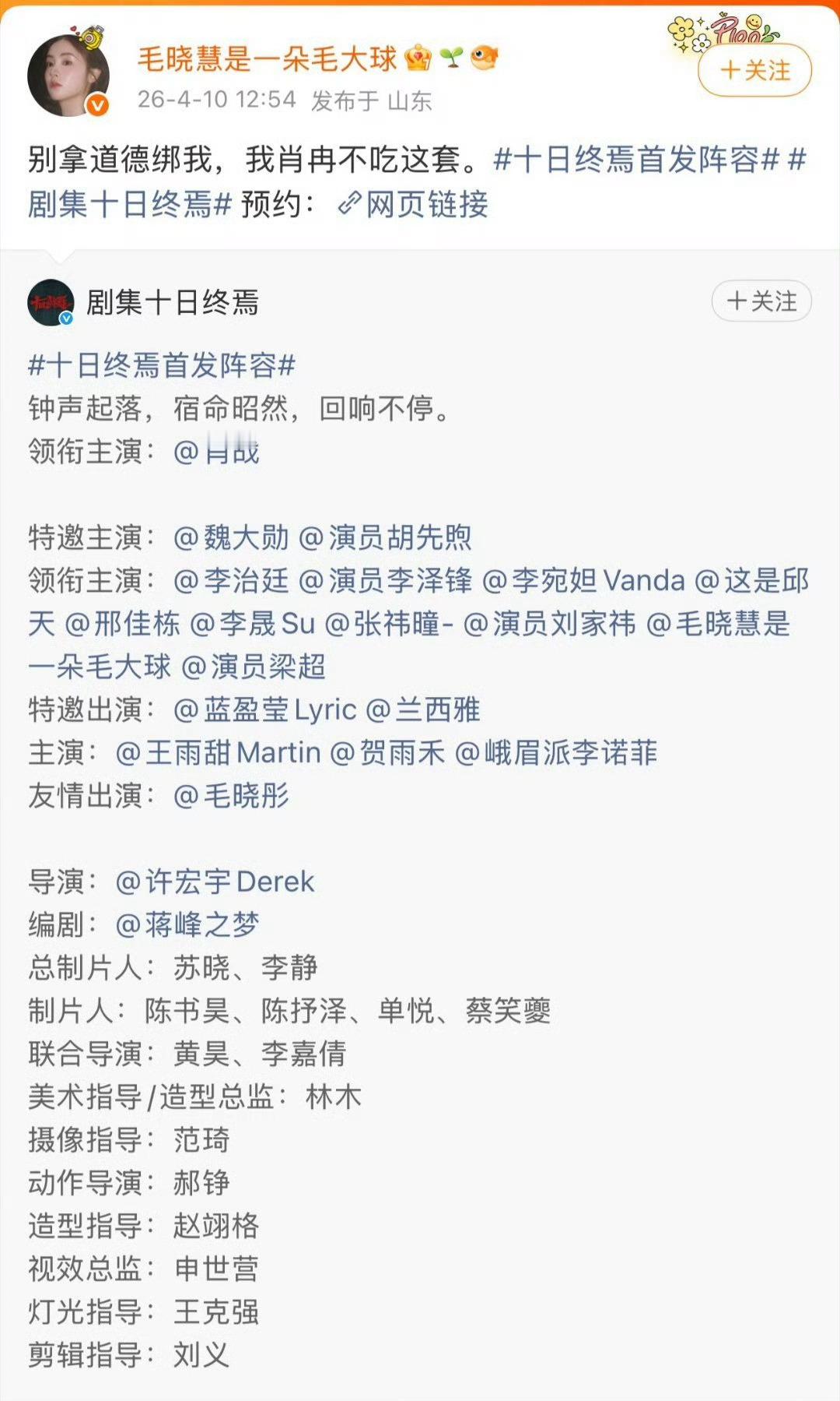 十日终焉毛晓慧演肖冉期待毛晓慧挑战复杂反派肖冉!跳出舒适圈的全新突破,看她如何演绎内心的挣扎与极致。十日终焉首发阵容给足惊喜,坐等开播!十日终焉官宣毛晓慧演肖冉 十日终焉首发阵容