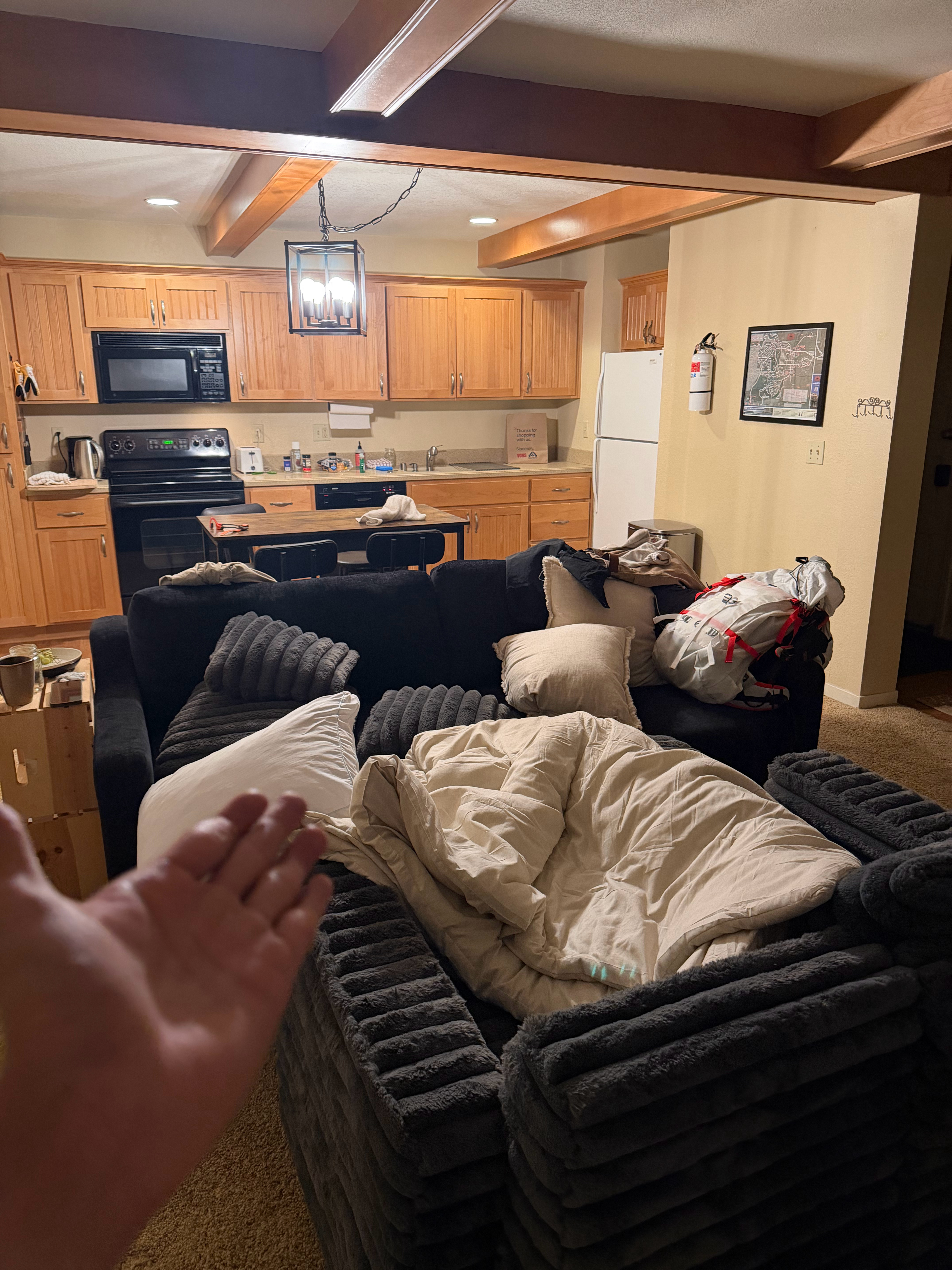 预算有限,小乔睡卧室,我只能睡厨房了,但我还真挺喜欢这感觉的像狗窝一样,特有安全感 美国·内华达山脉度假山林小屋(The Lodge at Sierra Nevada Resort)