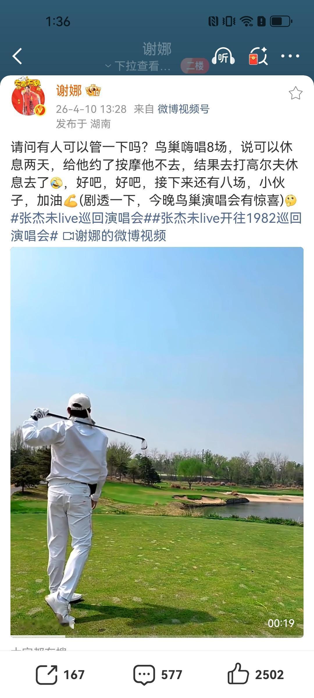 谢娜问有人可以管一下张杰吗谢娜发文问有人可以管一下张杰吗?鸟巢嗨唱了8天还要去打高尔夫!可见杰哥多爱打高尔夫了!娜姐还透露今晚鸟巢演唱会有惊喜!我已经开始期待了怎么办!谢娜剧透今晚鸟巢演唱会有惊喜谢娜说今晚张杰演唱会有惊喜