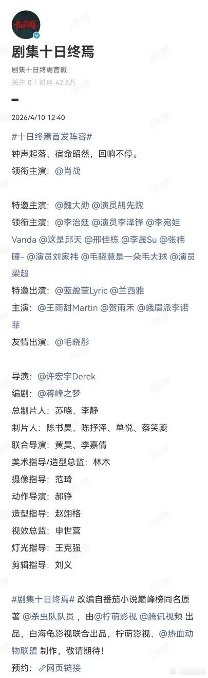 《十日终焉》阵容官宣,这个阵容是真不错!都是有演技的,看得出是想好好做剧的。肖战