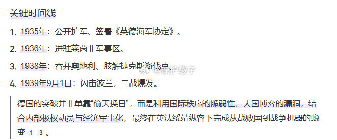 日本自卫队420人登上菲律宾时隔85年,日本 兵再一次登陆了菲律宾。唯一的变化是1941年日本突然袭 击的是住在菲律宾家的美国大兵,而2026年是美国大兵邀请日本寇人一起在菲律宾演习。 所以这近百年来,菲律宾在美国手里浑浑噩噩的过日子将近四代人——这么长的时间,就算是印度也够用静卧和牛屎把英国糊走两遍了。除了用“奇葩”,“垃圾”来形容菲律宾,暂时无法找到新的词。或许再过几十年会回到部落状态? 而对于日本,有一个很明显的参照,那就是德国。AI总结得很到位,足够一般判断了。请注意关键的1933年,之后就加速变化。 或许,此时2025高市的出现,也是彼刻1933画家的登顶。日本一步步把红线全试探一遍袋子时评