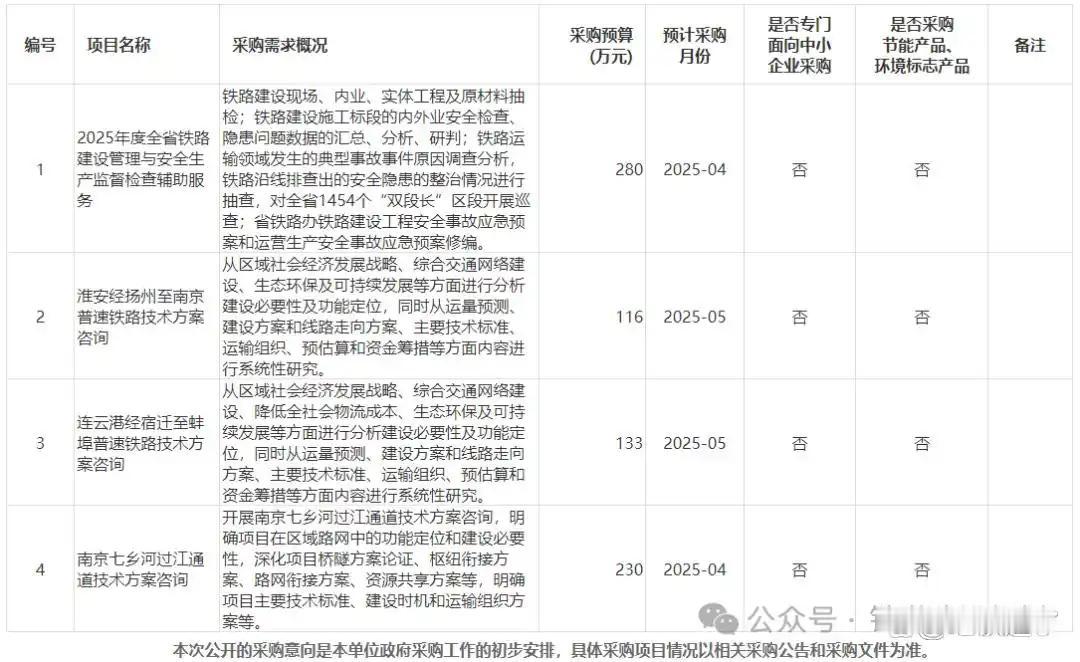 2025年2月江苏省铁路办公室发布采购意向公告,包括3个铁路项目的技术方案咨询工作,其中之一就是连云港经宿迁至蚌埠普速铁路。