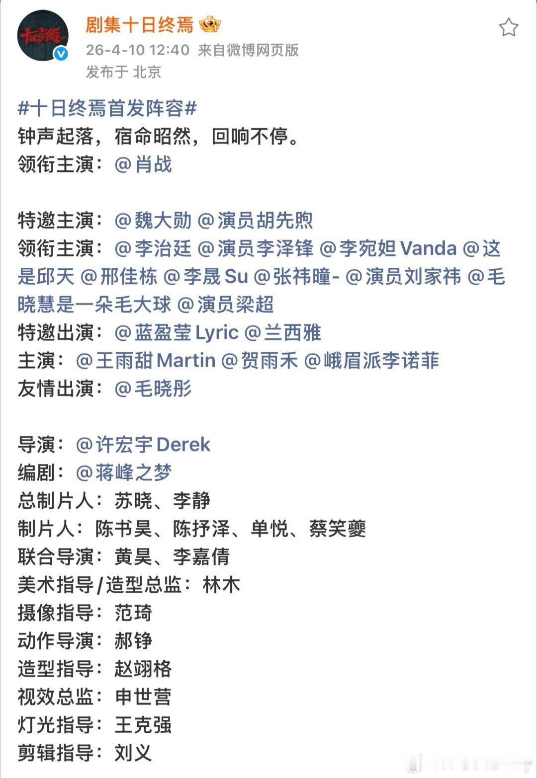 十日终焉官宣阵容表 肖战、魏大勋、胡先煦、李泽锋、李宛妲、蓝盈莹、邱天、毛晓彤,《十日终焉》官宣首发阵容未免太梦幻!云瑶是李宛妲来演哎,有点期待了。颜值很抗打,第一眼就是对味的,清冷又带点危险,狠狠期待宛妲会怎么呈现云瑶这个轴到近乎偏执的角色了,估计很带感