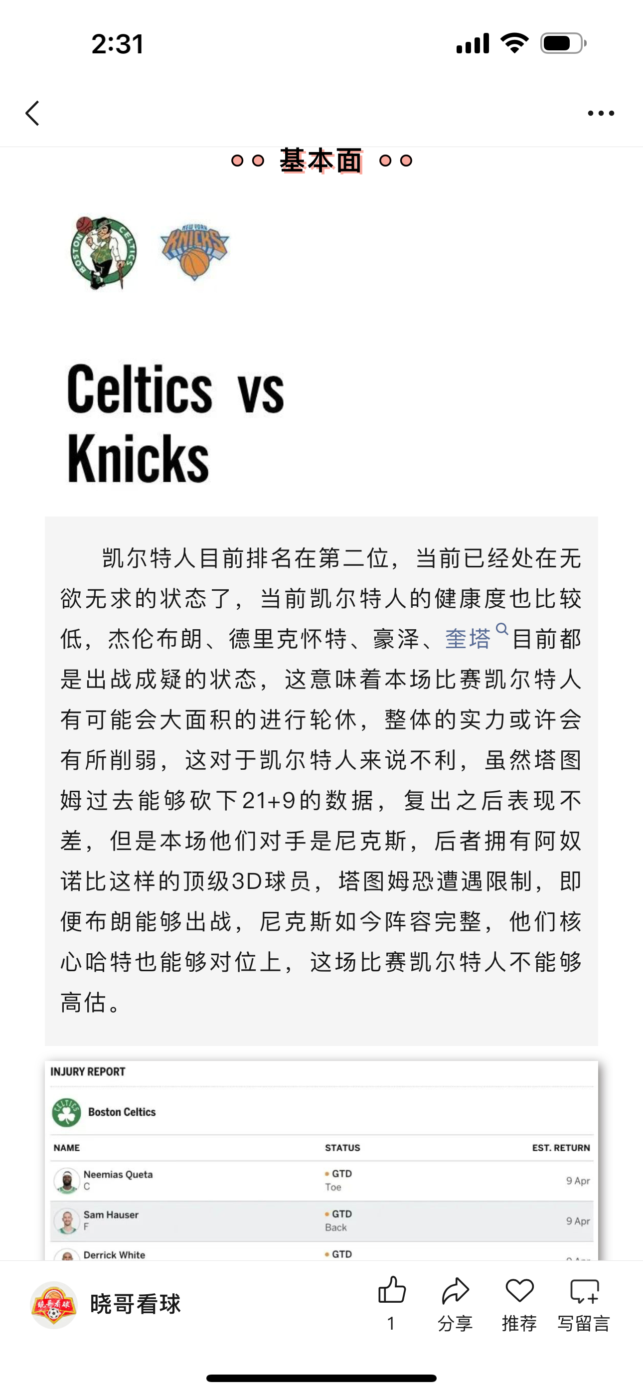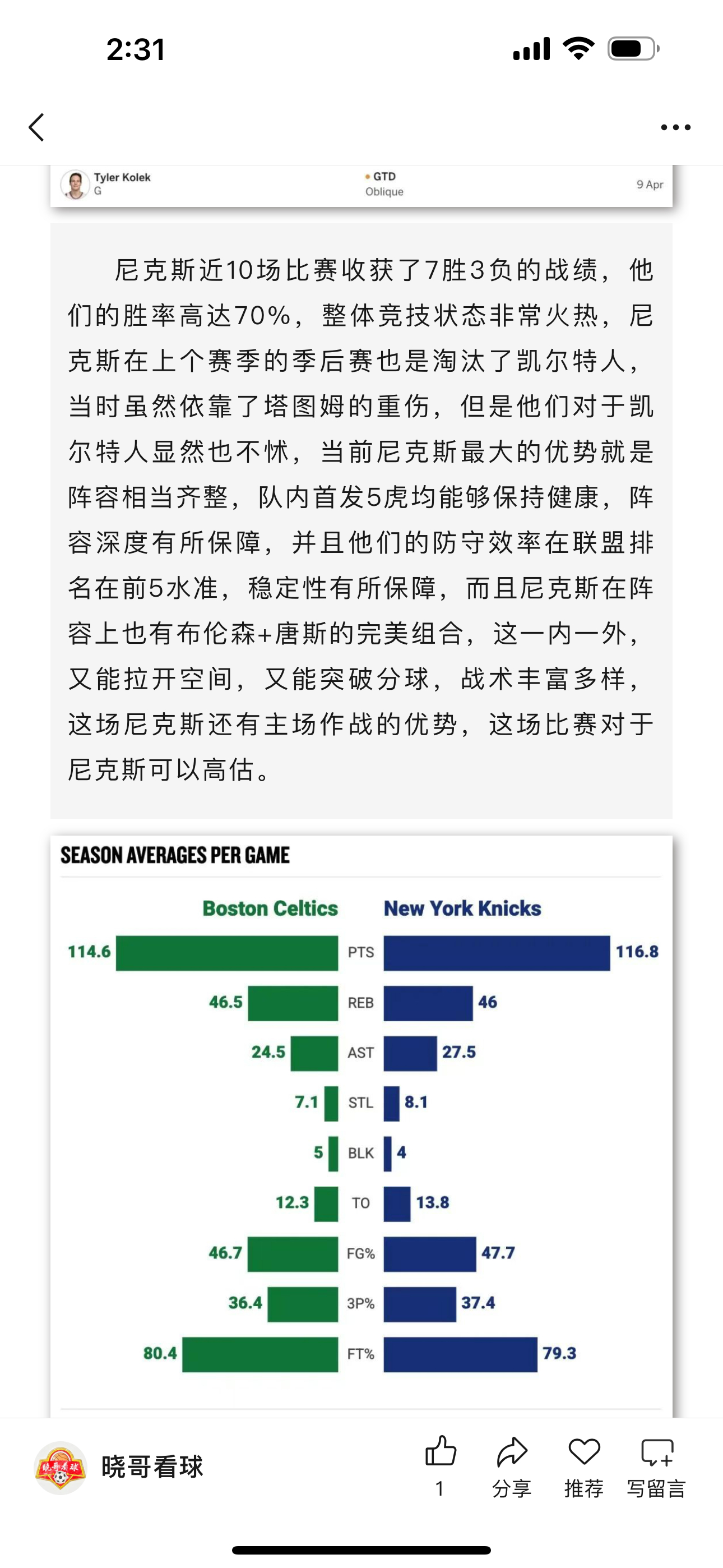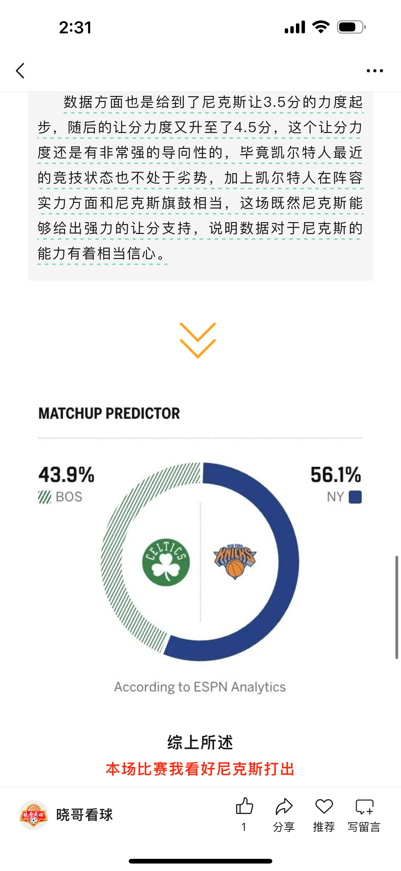 昨日公推篮球获得好评成绩,篮球公推尼克斯方向成功收获好评,这场比赛布朗因伤缺阵,我赛前就已经提到了凯尔特人的伤病隐患,而尼克斯阵容完整,且本身即战力不输凯尔特人,即便凯尔特人有复仇意志,但是面对实力差距终究还是难以对抗,这场好评在预料之内。篮球预测尼克斯nba体彩尼克斯vs凯尔特人