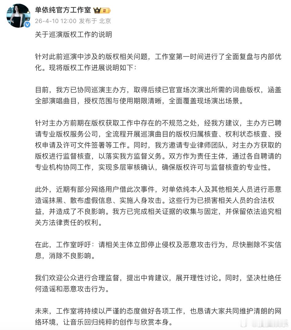 单依纯方巡演版权工作说明 针对此前巡演中涉及的版权相关问题,单依纯工作室在全面复盘与内部优化后发布声明。