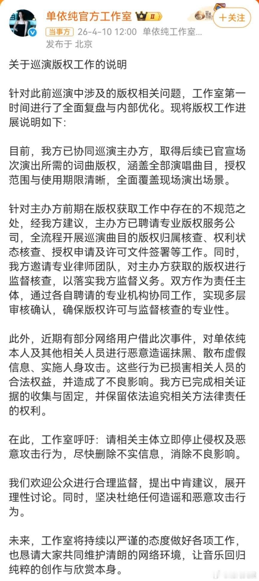 单依纯已取得后续演出词曲版权单依纯工作室巡演版权说明4月10日,发布关于巡演版权工作的说明,其中提已协同巡演主办方,取得后续已官宣场次演出所需的词曲版权,涵盖全部演唱曲目,授权范围与使用期限清晰,全面覆盖现场演出场景。