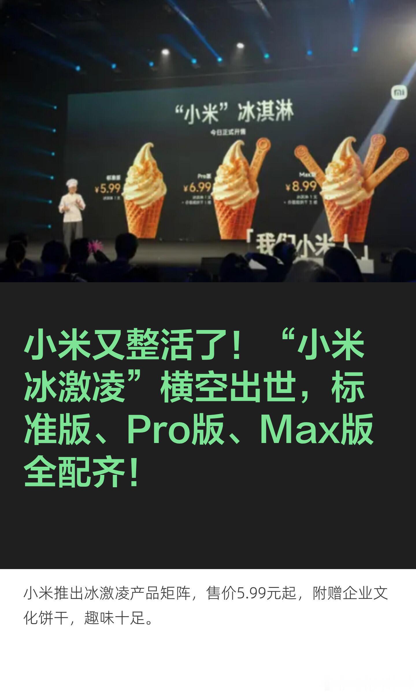 小米食堂发布小米冰激凌小米举办2026价值观大会,小米食堂在大会上发布新品“小米”冰淇淋。冰淇淋延续了小米汽车的命名方式,推出标准版、Pro版、Max版三种版本,售价分别为5.99元、6.99元、8.99元。