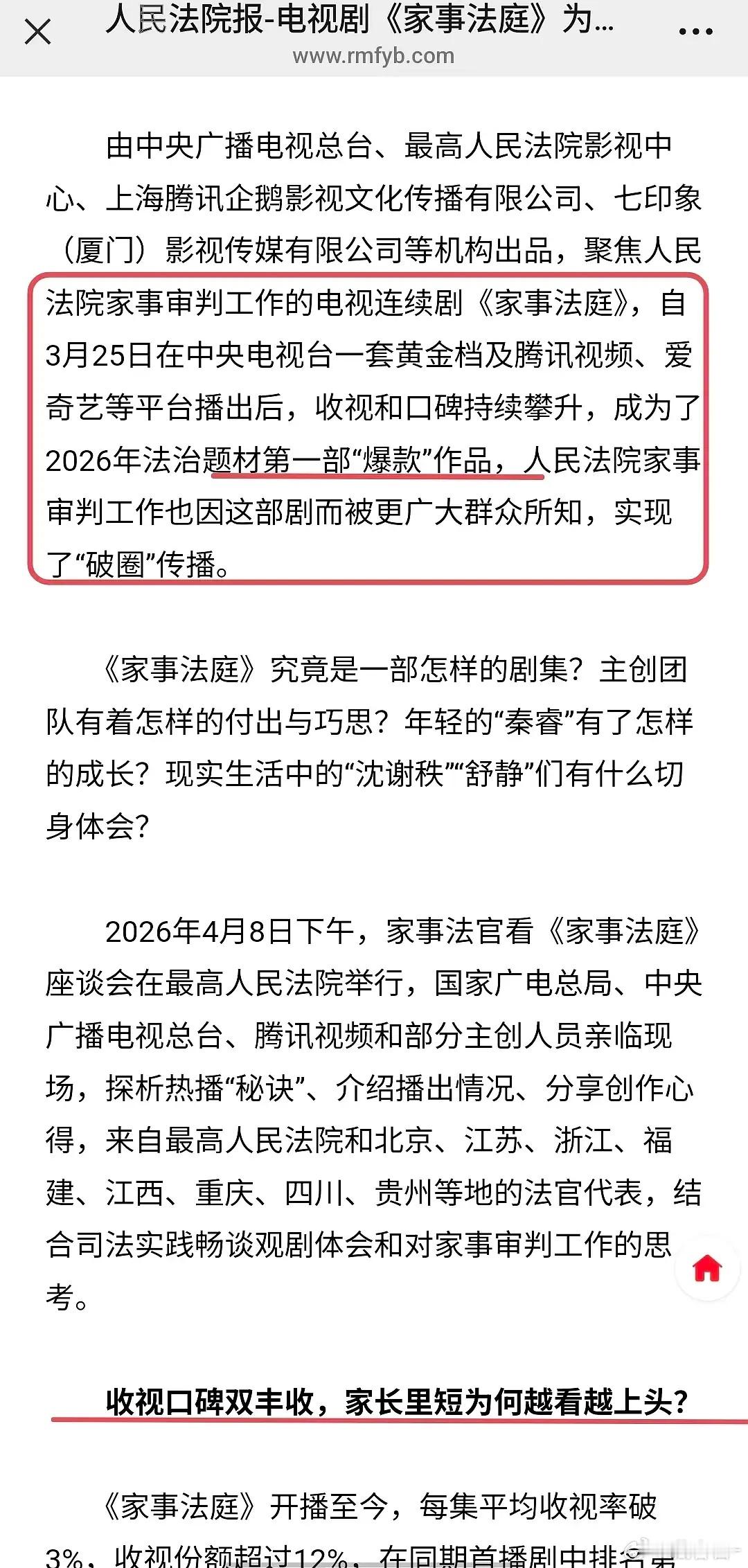 官方最高法认证:家事法庭成为“2026法治题材第一部爆款作品”该剧已出CVB集均3.045,暂央一年亚,同题材第一