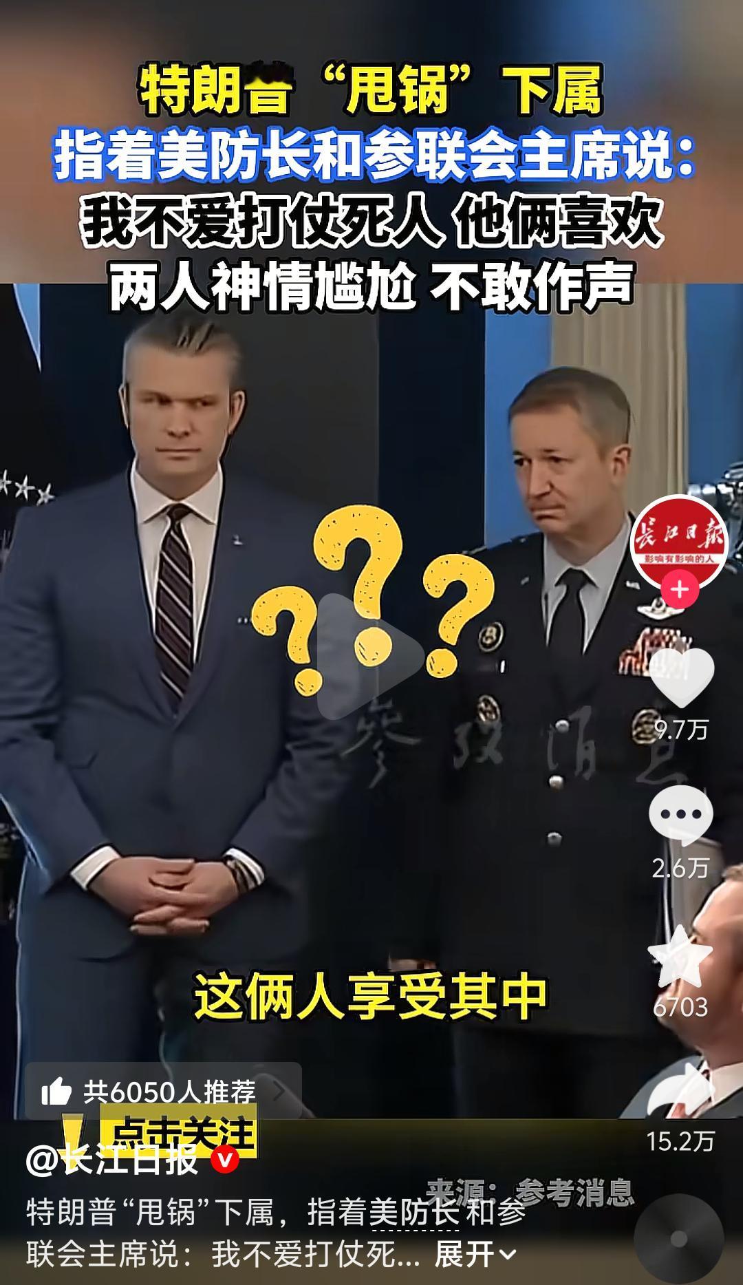 特朗普再度甩锅! 特朗普声称自己厌恶战争,因为打仗会死人,他对此十分反感,可下属却很享受这个过程。说着,他还伸手指了指身旁的两人。 那两人的神情要多窘迫有多窘迫。 想来他们心里都在暗骂:这不要脸的,真想把特朗普祖宗问候个遍!