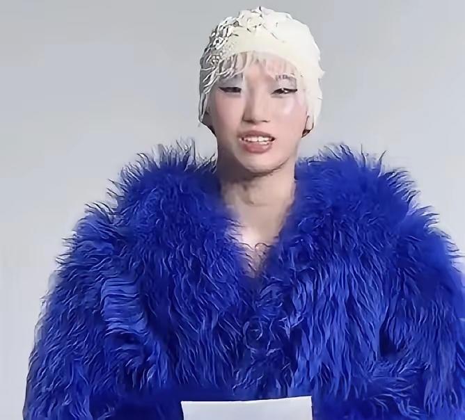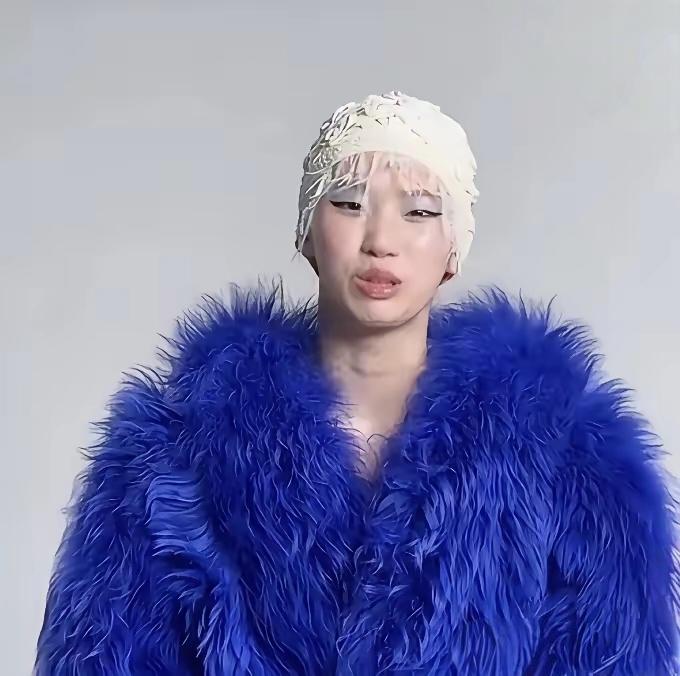 宝蓝色的皮草裹着一身,像把刚从染缸里捞出来的拖把披在了身上,廉价又臃肿;白色的头套硬凹出所谓的“造型感”,毛躁的碎发贴在额前,活像没摘干净的浴帽;再配上夸张到变形的眼妆、油光满面的底妆,整张脸透着一股说不出的违和感,完全是把“用力过猛”四个字焊在了脸上。