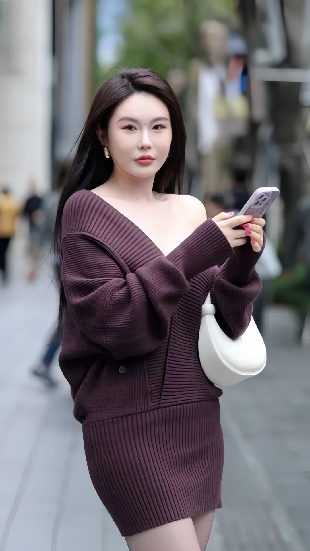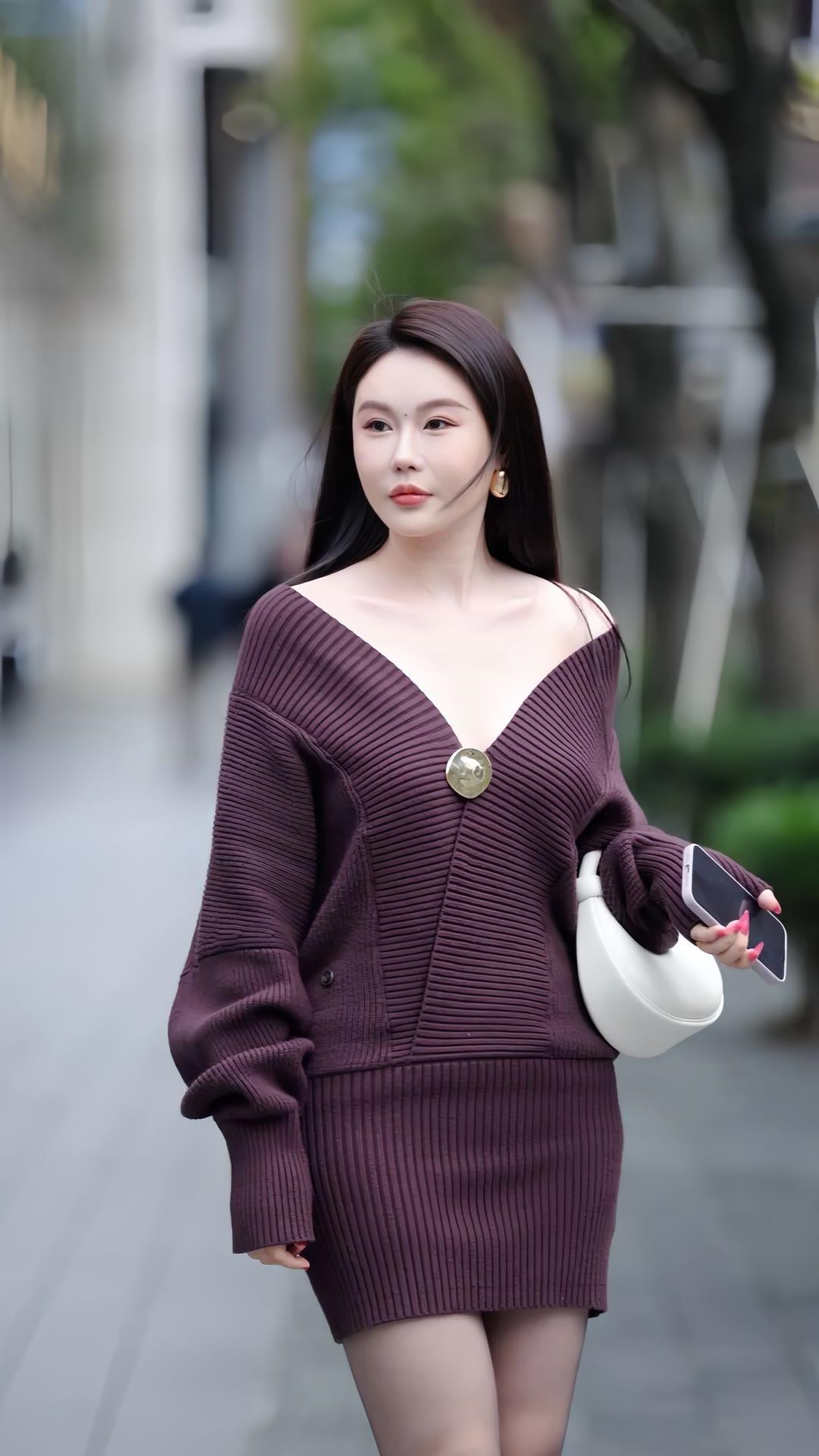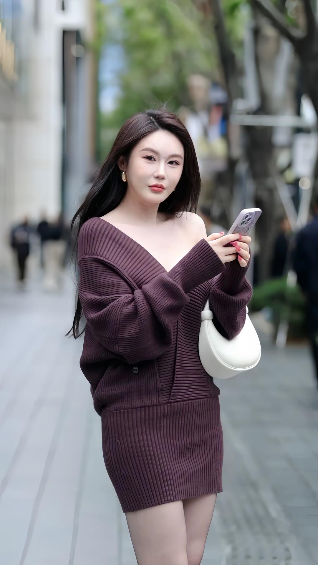 紫色大V领针织套装裙,微胖女孩穿出别样韵味!