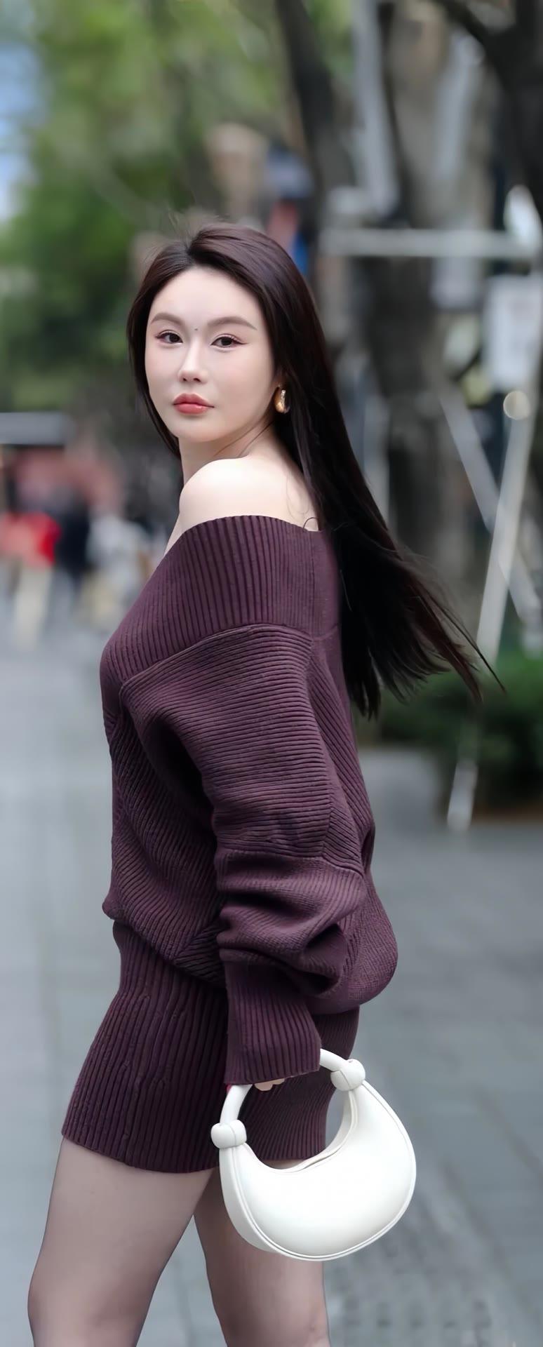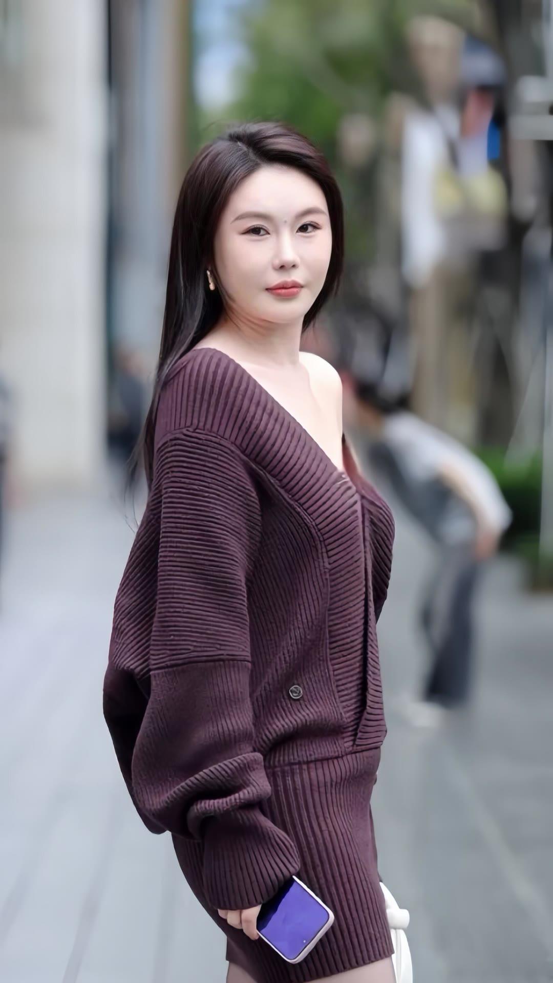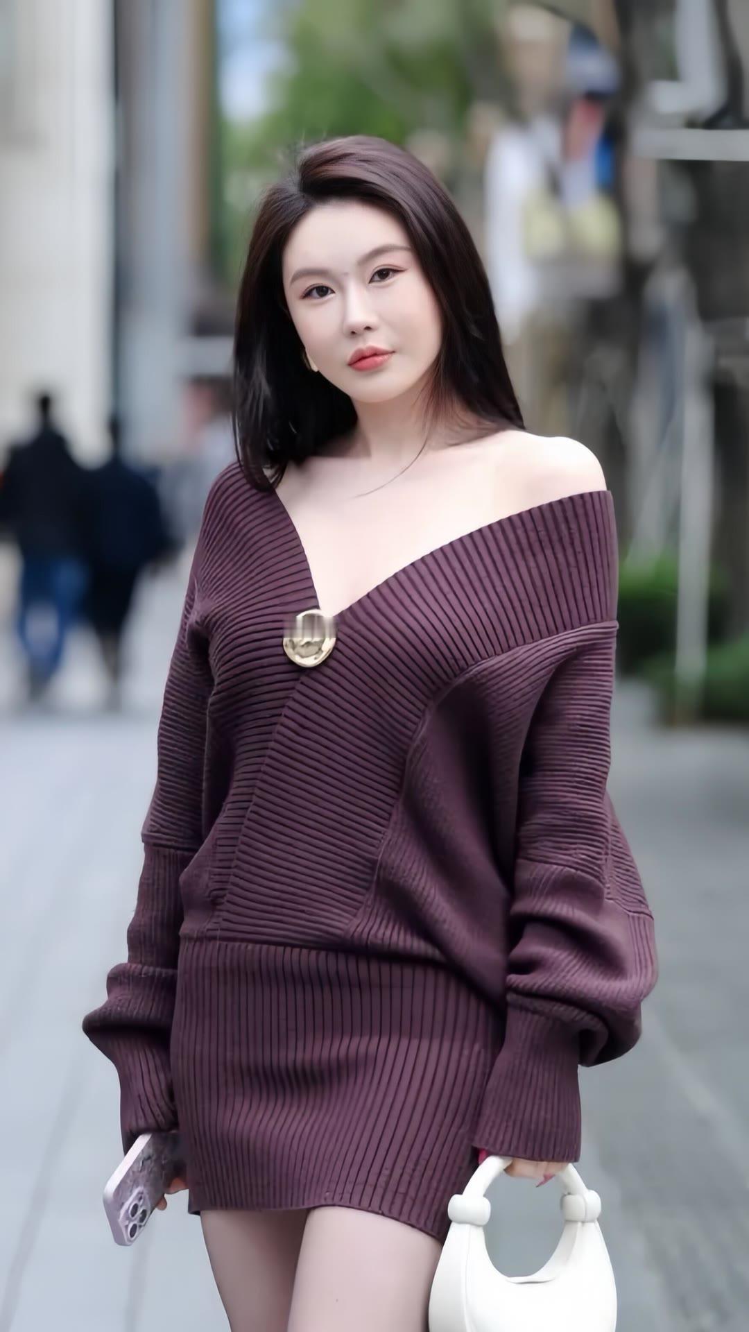 紫色大V领针织套装裙,微胖女孩穿出别样韵味!