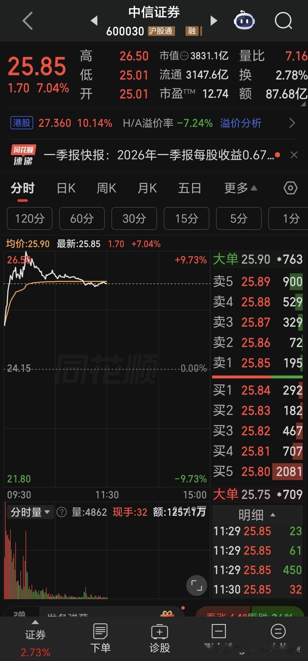 今天上午市场上最大的亮点可能来自于中信证券,券商板块大面积飘红是一个积极信号,但是由中信证券来发动还是出乎意料的。