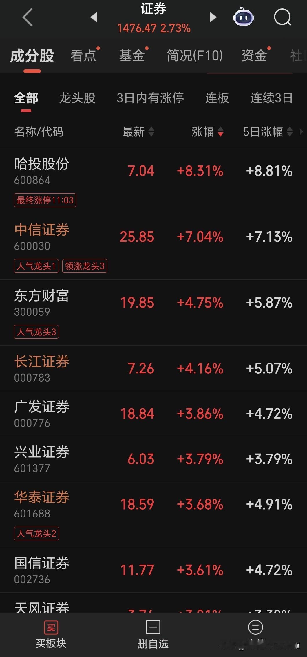 我们可以看到哈投股份,这个不是亮点,但是紧随中信证券之后的是东方财富和长江证券、广发证券,就非常值得注意,说明有主流的券商投资资金进来活动。