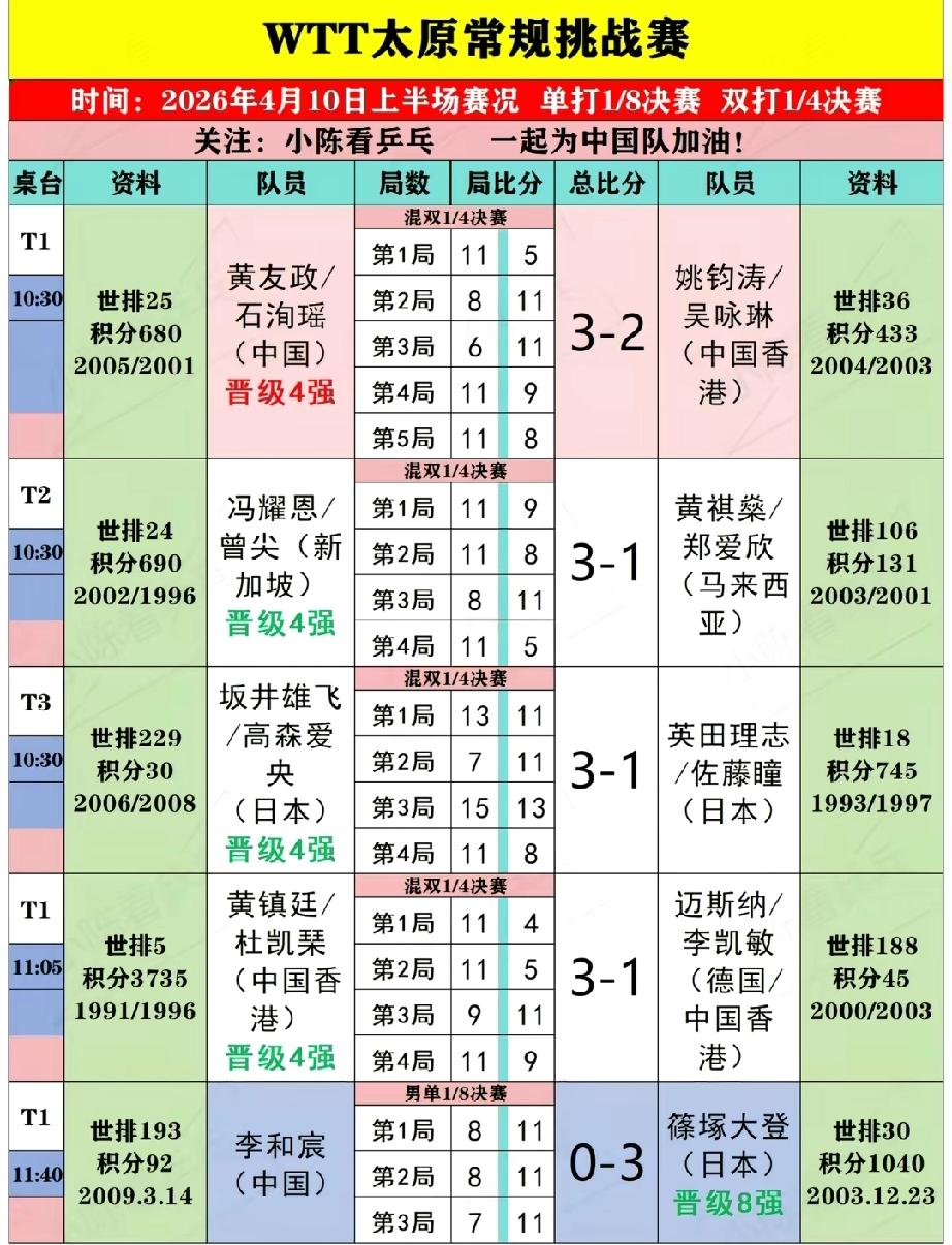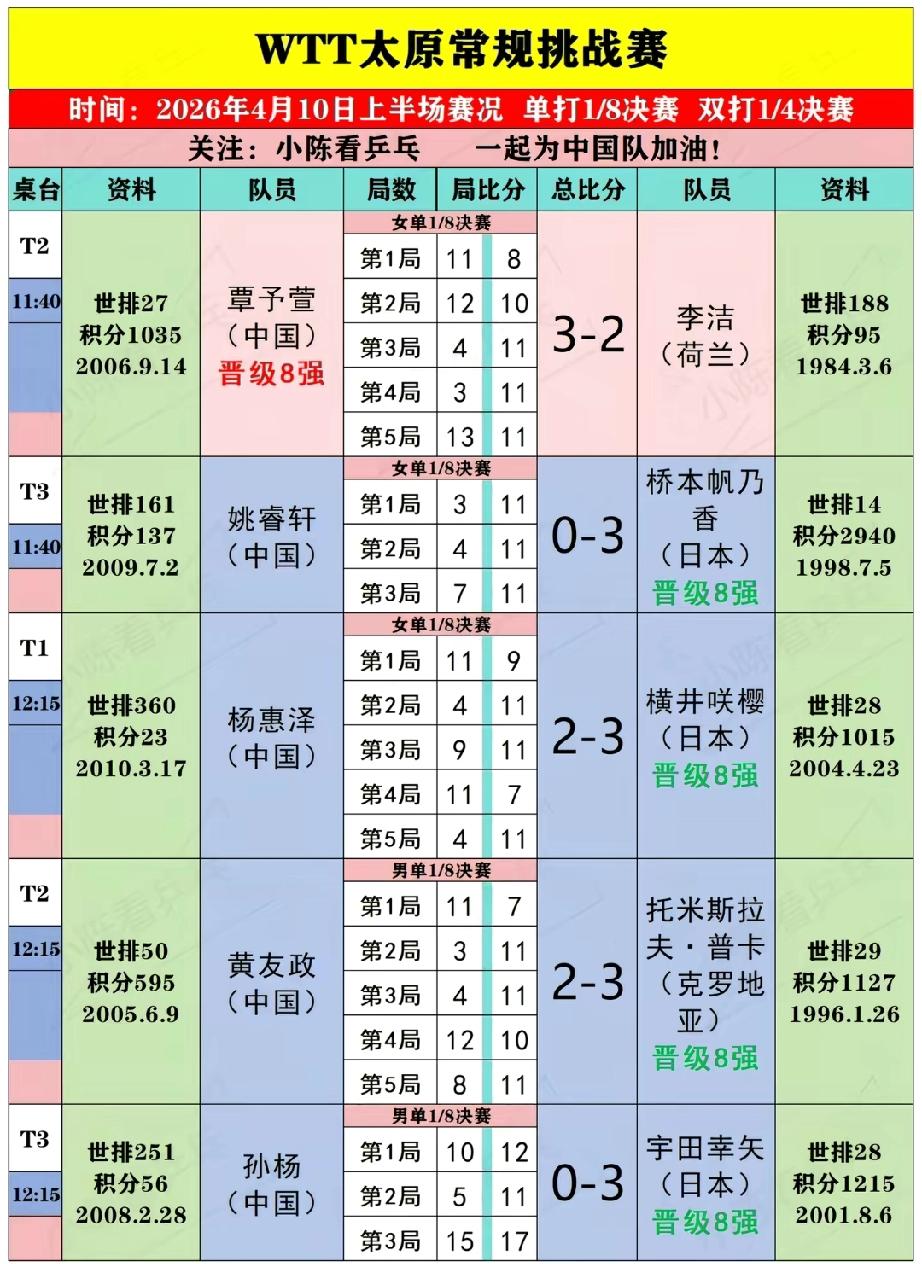 这不,截止4月10日下午,太原站才打了1天半,国乒男单就剩3名球员了,温瑞博、陈垣宇、李天阳,上届冠军向鹏、黄友政、李和宸都被淘汰了。