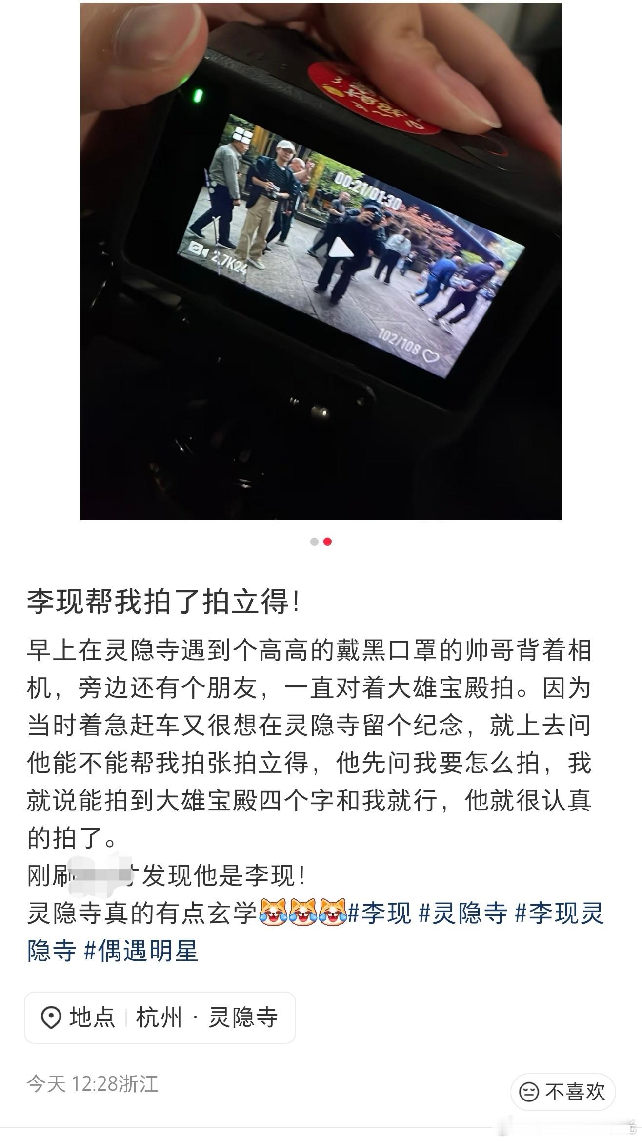 网友在灵隐寺偶遇一个戴口罩的高个帅哥背着相机,旁边还有个朋友,因为着急赶车又想留个纪念,于是就叫帅哥给她拍了拍立得,回来上网发现这个帅哥是李现。这是啥运气?
