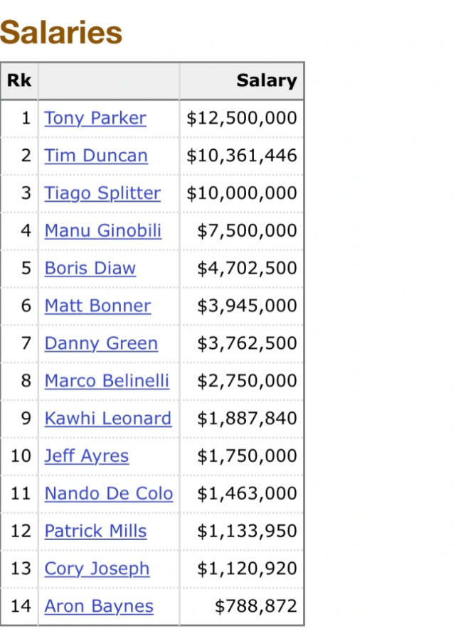 顺便一提马刺在13年总决赛后,也就是经常被提到的斯普利特被詹姆斯正面血帽后用4年3600万续约了斯普利特,年薪是马刺队内第3,仅次于帕克和邓肯,而斯普利特也回报了马刺这份信任,14年季后赛的WS排在队内第3,仅次于邓肯和莱昂纳德,同时在总决赛血帽韦德找回了场子。