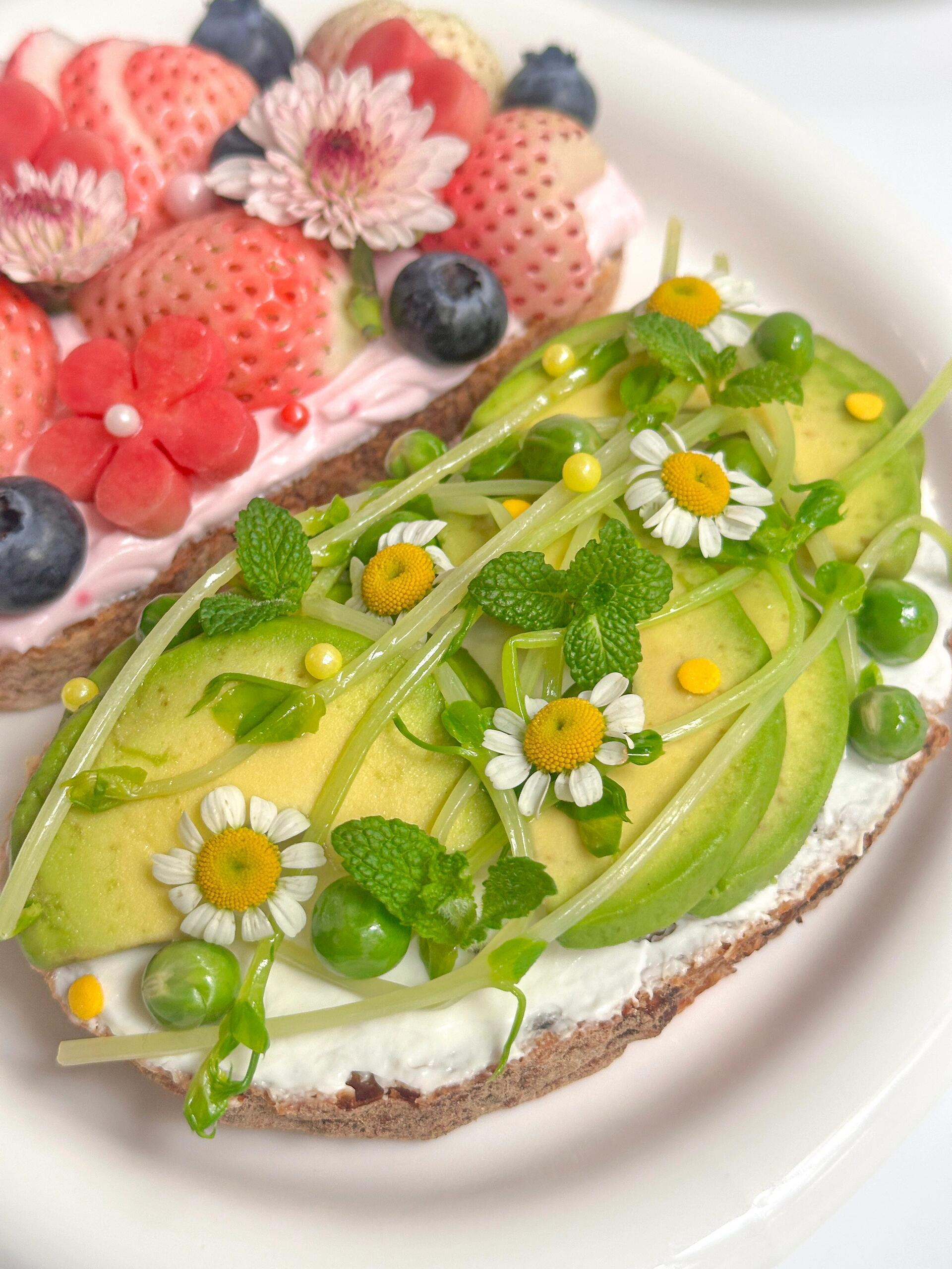 希腊酸奶抹在欧包上,青豆和豌豆苗过水炒熟在上面摆上牛油果🥑切片、青豆和豌豆苗最后用洋甘菊装饰点缀