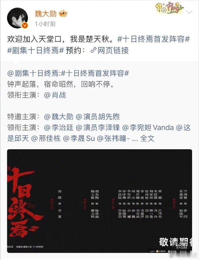 魏大勋官宣出演楚天秋 魏大勋官宣楚天秋,金丝眼镜+西装,冷漠阴鸷又带破碎感,角色适配度封神。 十日终焉