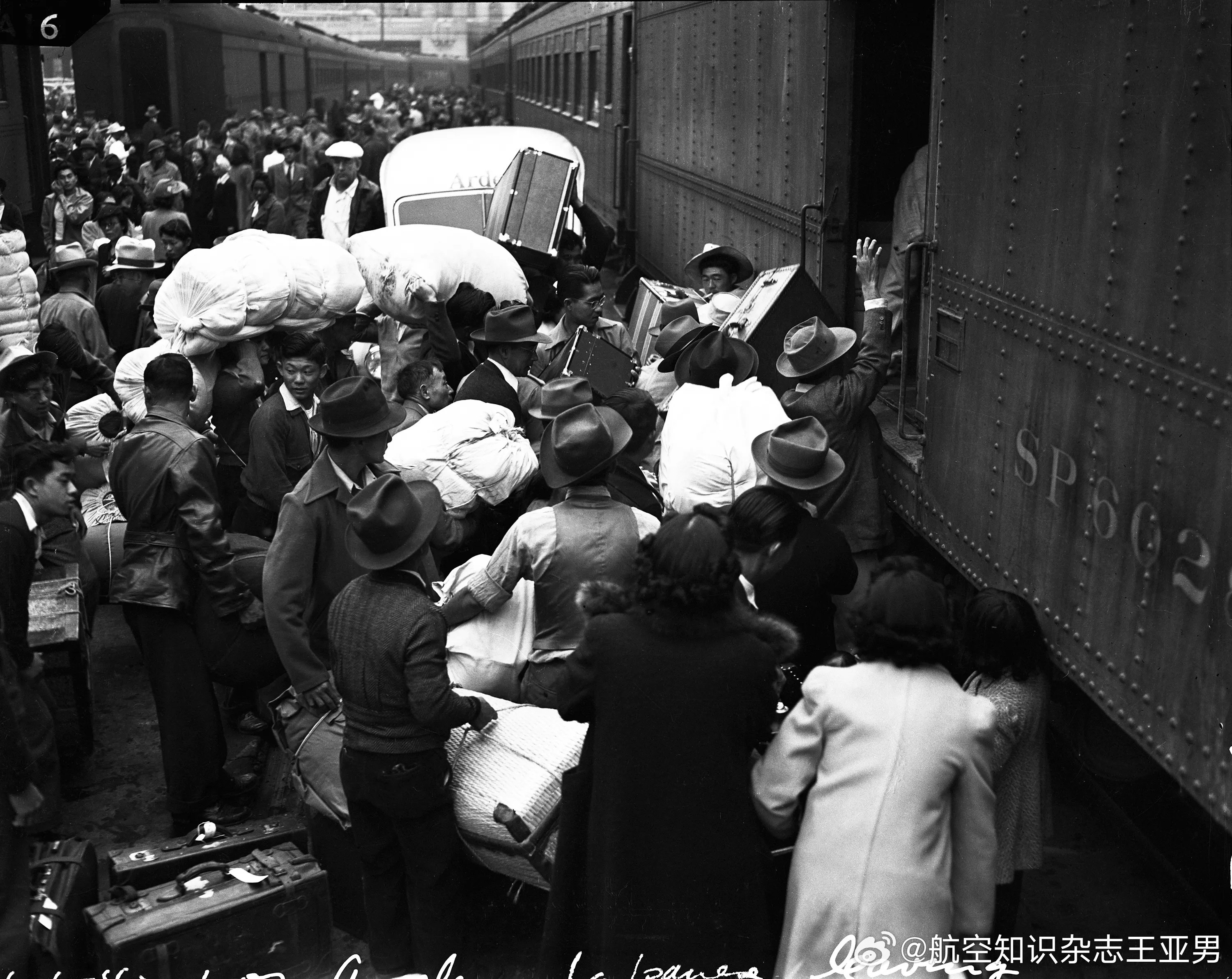 美国是个移民国家不假,许多人愿意迁居美国也不假。但是在特殊情况下,在美国的外裔移民可能遭遇严重的信任乃至人身危机。1942年2月19日,美国总统罗斯福在一份名为第9066号行政命令的文件上签下了名字,要求将居住在美国西海岸的总计近12万日裔人士驱逐并集中监禁——珍珠港事件之后,美国民众普遍对日本感到恐惧和愤怒,复仇的烈焰升腾。许多美国民众担忧居住在美国的日裔会从事间谍和破坏活动,甚至认为它们可能为日本帝国入侵美国西海岸的行动提供便利。当时美国各大报刊纷纷呼吁政府采取行动,9066号行政令,就是对这种压力的回应。被要求迁移到指定地居住的日裔被迫变卖资产,搬迁到沙漠中心地带的木制板房。美国专门成立了战时安置局负责此项工作,并为这些日裔设立了安置中心(许多人干脆称做集中营),他们被要求不得离开,并从事各种各样的工作。随着战争的推进,军方对日本可能入侵的担忧逐渐消退,战时安置局开始允许越来越多的“集中营居民”离开。这些日裔可以参军、进入大学学习或在西海岸以外的地方就业谋生。二战期间,超过三万名日裔美国青年——包括数千名来自集中营的志愿者和应征入伍者,在美军服役。到1944年底,已有超过4万人获释。1945年1月2日,驱逐令正式解除,这意味着仍在集中营中的人可以自由返回家园,但此时那些被连根拔起的许多人已经无家可归。战后,被驱逐和监禁的日裔纷纷要求政府赔偿。为此又是一番争论和折腾,直到1976年,杰拉尔德·福特总统撤销了第9066号行政命令。随后,吉米·卡特总统成立了一个委员会,负责研究解决方案。1988年,罗纳德·里根总统签署了《1988年公民自由法案》。该法案规定政府必须就此事正式道歉,并向所有因第9066号行政命令而被强制迁移的幸存者提供2万美元的赔偿——2万美元,看似不少,但买不回那些人的幸福人生。以下为历史照片及说明★曼扎纳尔安置中心,1942年。★被强制迁移者努力把行李塞进火车,这列火车将把他们带到安置中心,1942年。★负责安置中心警卫任务的宪兵部队★莫奇达一家在加利福尼亚州海沃德等待他们的转运巴士。每个人都佩戴着身份识别牌。这个家庭原本在海沃德经营着一家苗圃和五座温室,现在他们必须放弃一切前往安置中心。★位于曼扎纳尔安置中心的妇女正在为军队制作防空伪装网。★曼扎纳尔集中营的成排营房。该营地位于洛杉矶东北230英里处的内华达山脉东麓附近。★亚利桑那州波斯顿安置中心破败的营房,此时所有强制迁移人员已经被允许离开,1945年。